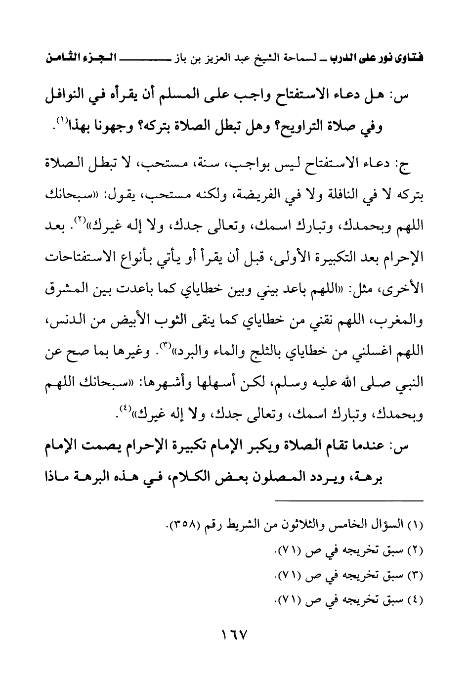 س: هل دعاء الاستفتاح واجب على المسلم أن يقرأه في النوافل وفي صلاة التراويح؟ وهل تبطل الصلاة بتركه؟ وجهونا بهذا (¬1)