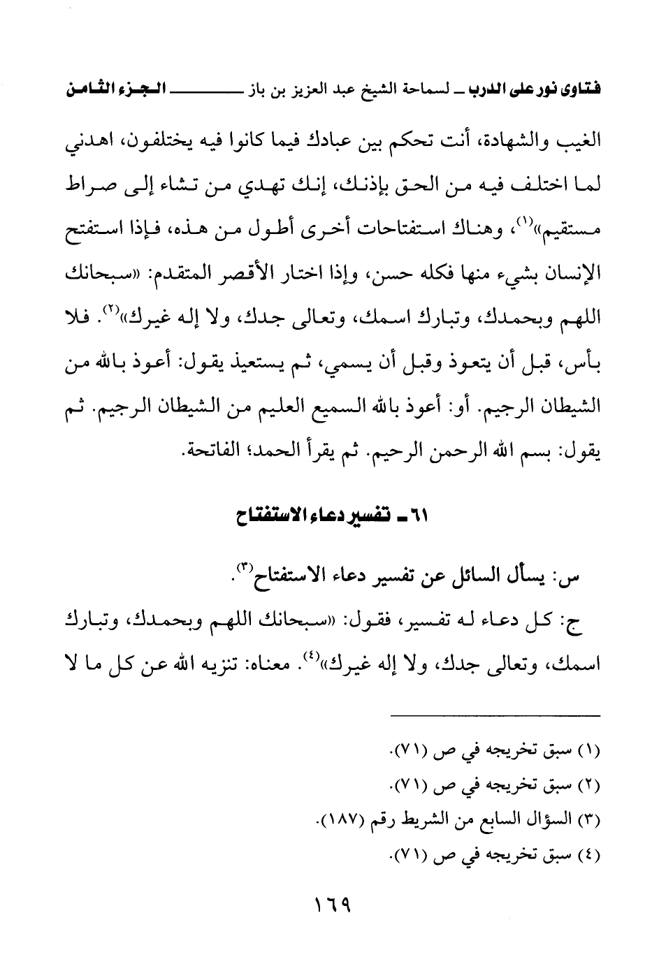ج: كل دعاء له تفسير، فقول: «سبحانك اللهم وبحمدك، وتبارك اسمك، وتعالى جدك، ولا إله غيرك (¬2)» معناه: تنزيه الله عن كل ما لا