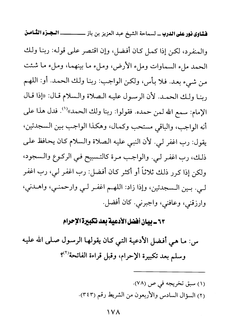 فدل هذا على أنه الواجب، والباقي مستحب وكمال، وهكذا الواجب بين السجدتين، يقول: رب اغفر لي. لأن النبي عليه الصلاة والسلام كان يحافظ على ذلك رب اغفر لي. والواجب مرة كالتسبيح في الركوع والسجود، ولكن إذا كرر ذلك ثلاثا أو أكثر كان أفضل: رب اغفر لي، رب اغفر لي. بين السجدتين، وإذا زاد: اللهم اغفر لي وارحمني، واهدني، وارزقني، وعافني، واجبرني. كان أفضل.