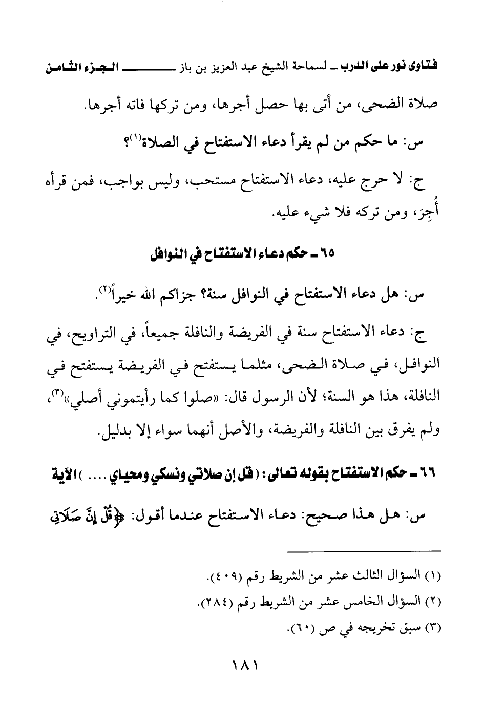 ج: دعاء الاستفتاح سنة في الفريضة والنافلة جميعا، في التراويح، في النوافل، في صلاة الضحى، مثلما يستفتح في الفريضة يستفتح في النافلة، هذا هو السنة؛ لأن الرسول قال: «صلوا كما رأيتموني أصلي (¬2)» ولم يفرق بين النافلة والفريضة، والأصل أنهما سواء إلا بدليل.