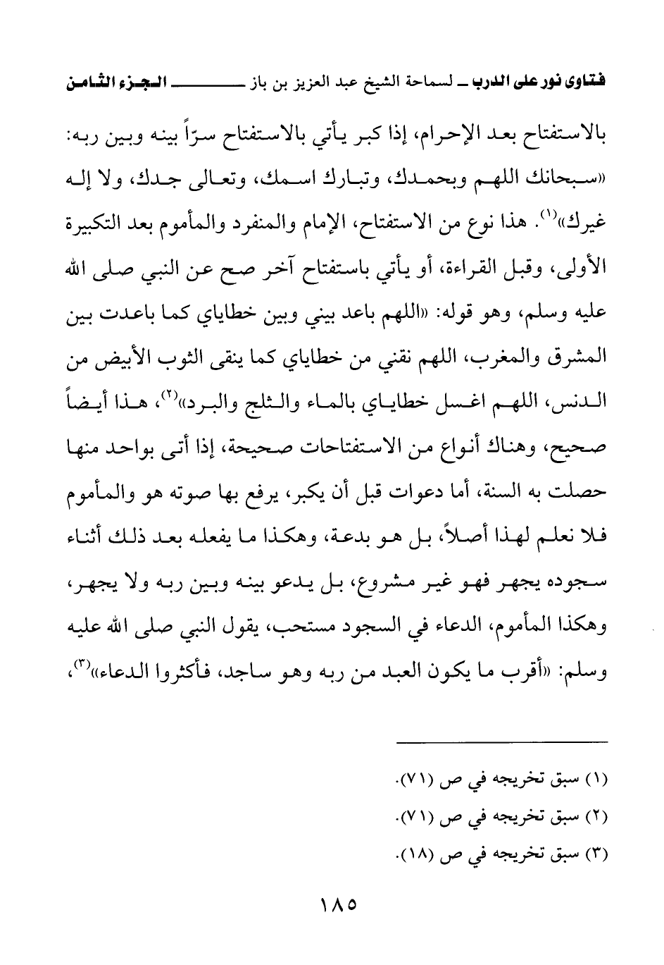 وهناك أنواع من الاستفتاحات صحيحة، إذا أتى بواحد منها حصلت به السنة، أما دعوات قبل أن يكبر، يرفع بها صوته هو والمأموم فلا نعلم لهذا أصلا، بل هو بدعة، وهكذا ما يفعله بعد ذلك أثناء سجوده يجهر فهو غير مشروع، بل يدعو بينه وبين ربه ولا يجهر، وهكذا المأموم، الدعاء في السجود مستحب، يقول النبي صلى الله عليه وسلم: «أقرب ما يكون العبد من ربه وهو ساجد، فأكثروا الدعاء (¬3)»