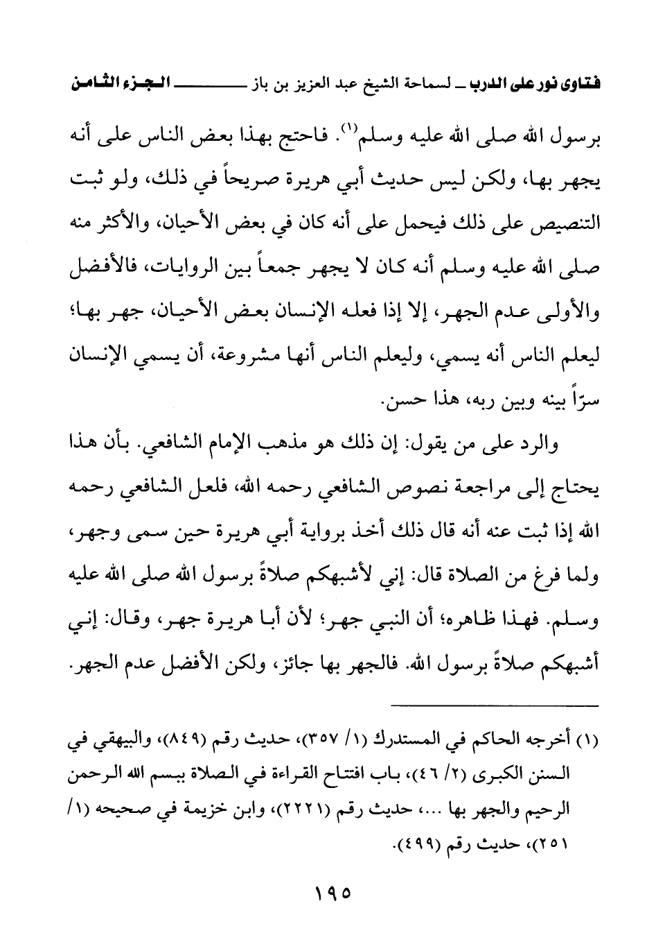 والرد على من يقول: إن ذلك هو مذهب الإمام الشافعي. بأن هذا يحتاج إلى مراجعة نصوص الشافعي رحمه الله، فلعل الشافعي رحمه الله إذا ثبت عنه أنه قال ذلك أخذ برواية أبي هريرة حين سمى وجهر، ولما فرغ من الصلاة قال: إني لأشبهكم صلاة برسول الله صلى الله عليه وسلم. فهذا ظاهره؛ أن النبي جهر؛ لأن أبا هريرة جهر، وقال: إني أشبهكم صلاة برسول الله. فالجهر بها جائز، ولكن الأفضل عدم الجهر