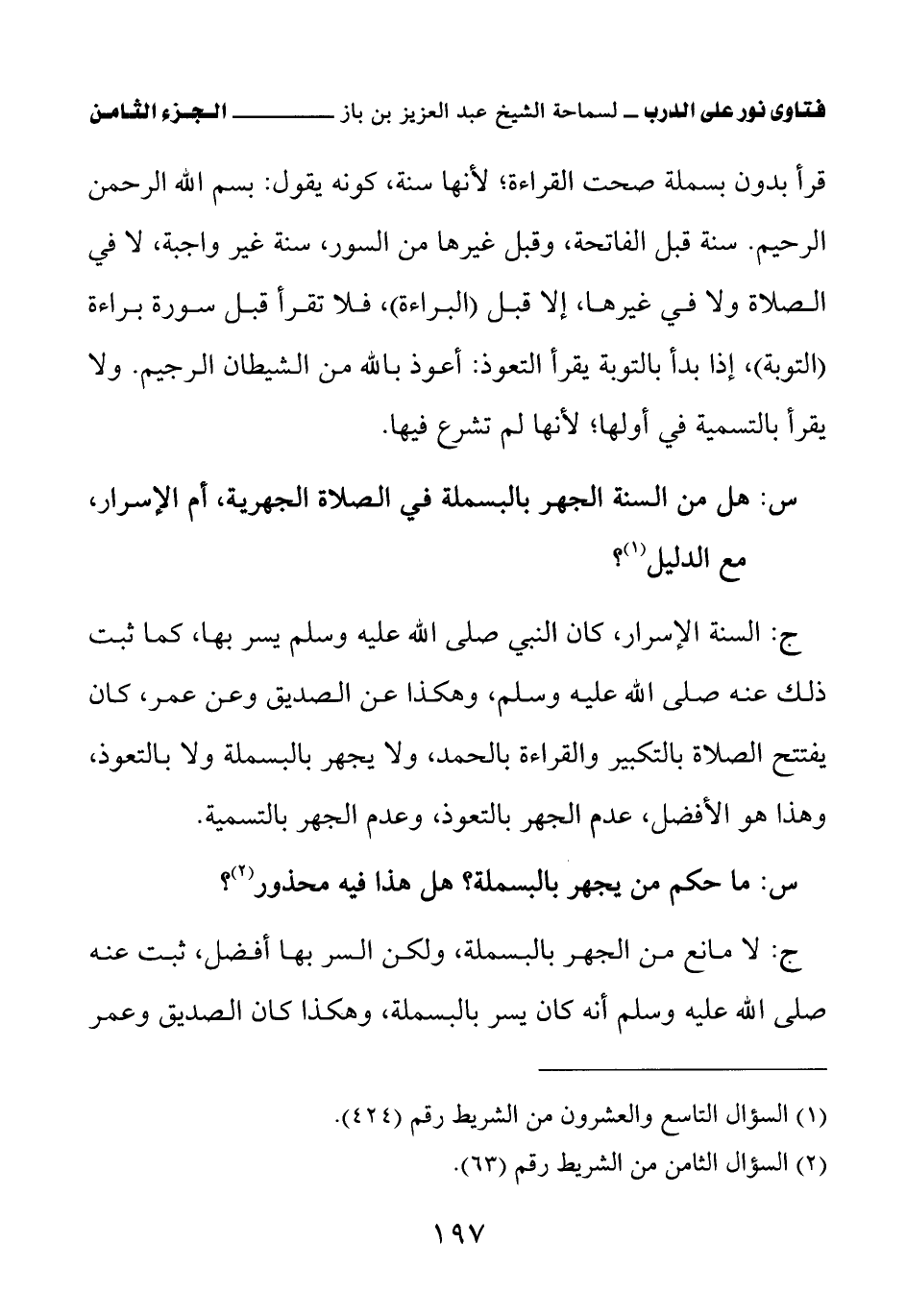 س: هل من السنة الجهر بالبسملة في الصلاة الجهرية، أم الإسرار، مع الدليل؟ (¬1)
