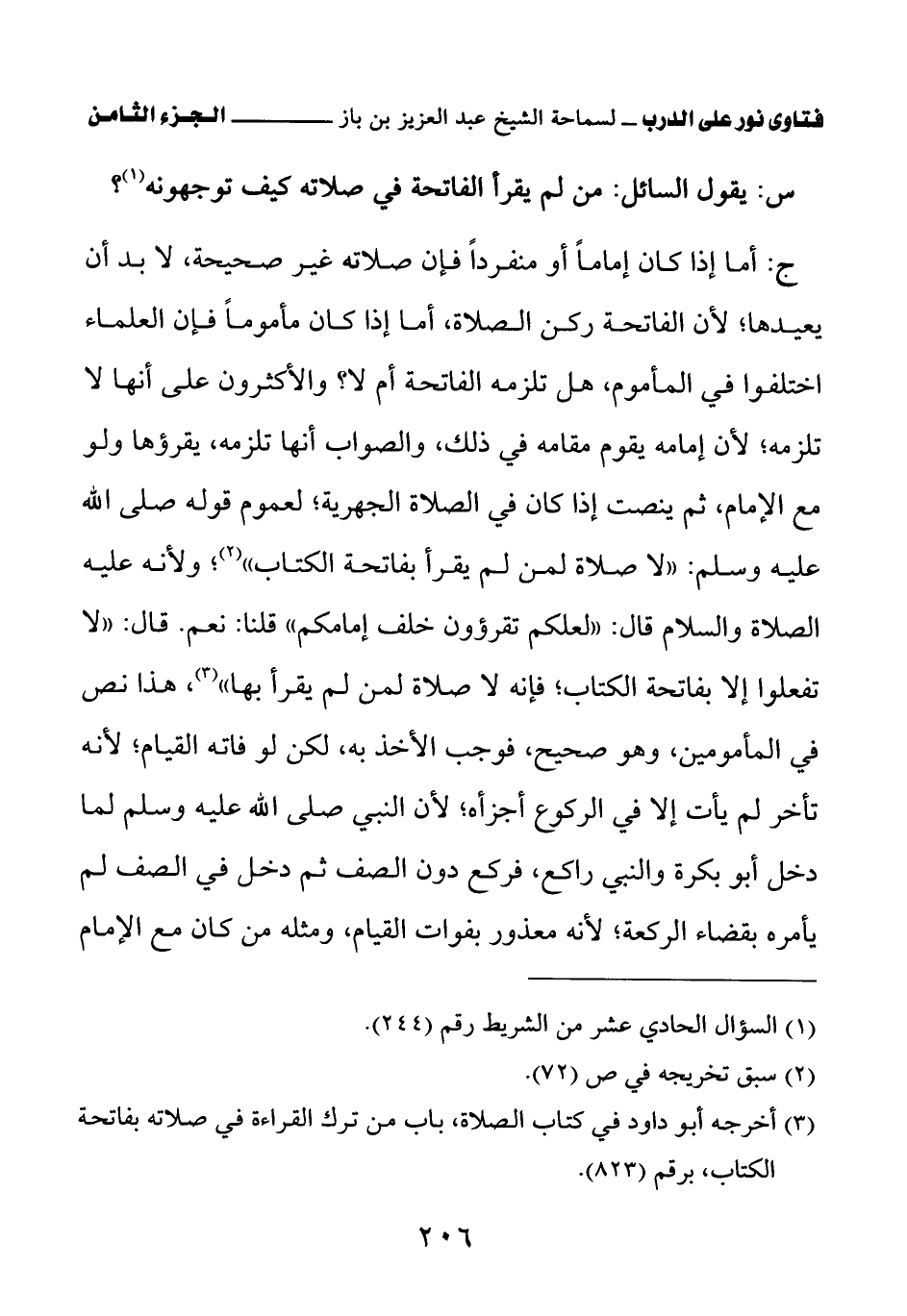 (¬3) أخرجه أبو داود في كتاب الصلاة، باب من ترك القراءة في صلاته بفاتحة الكتاب، برقم (823)