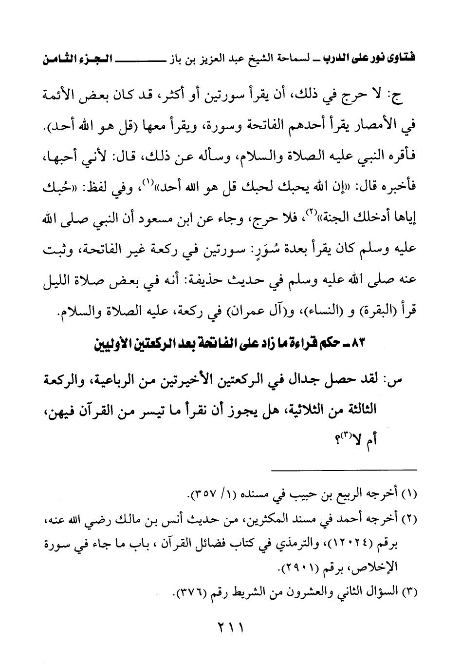 ج: لا حرج في ذلك، أن يقرأ سورتين أو أكثر، قد كان بعض الأئمة في الأمصار يقرأ أحدهم الفاتحة وسورة، ويقرأ معها (قل هو الله أحد). فأقره النبي عليه الصلاة والسلام، وسأله عن ذلك، قال: لأني أحبها، فأخبره قال: «إن الله يحبك لحبك قل هو الله أحد (¬1)» وفي لفظ: «حبك إياها أدخلك الجنة (¬2)» فلا حرج.