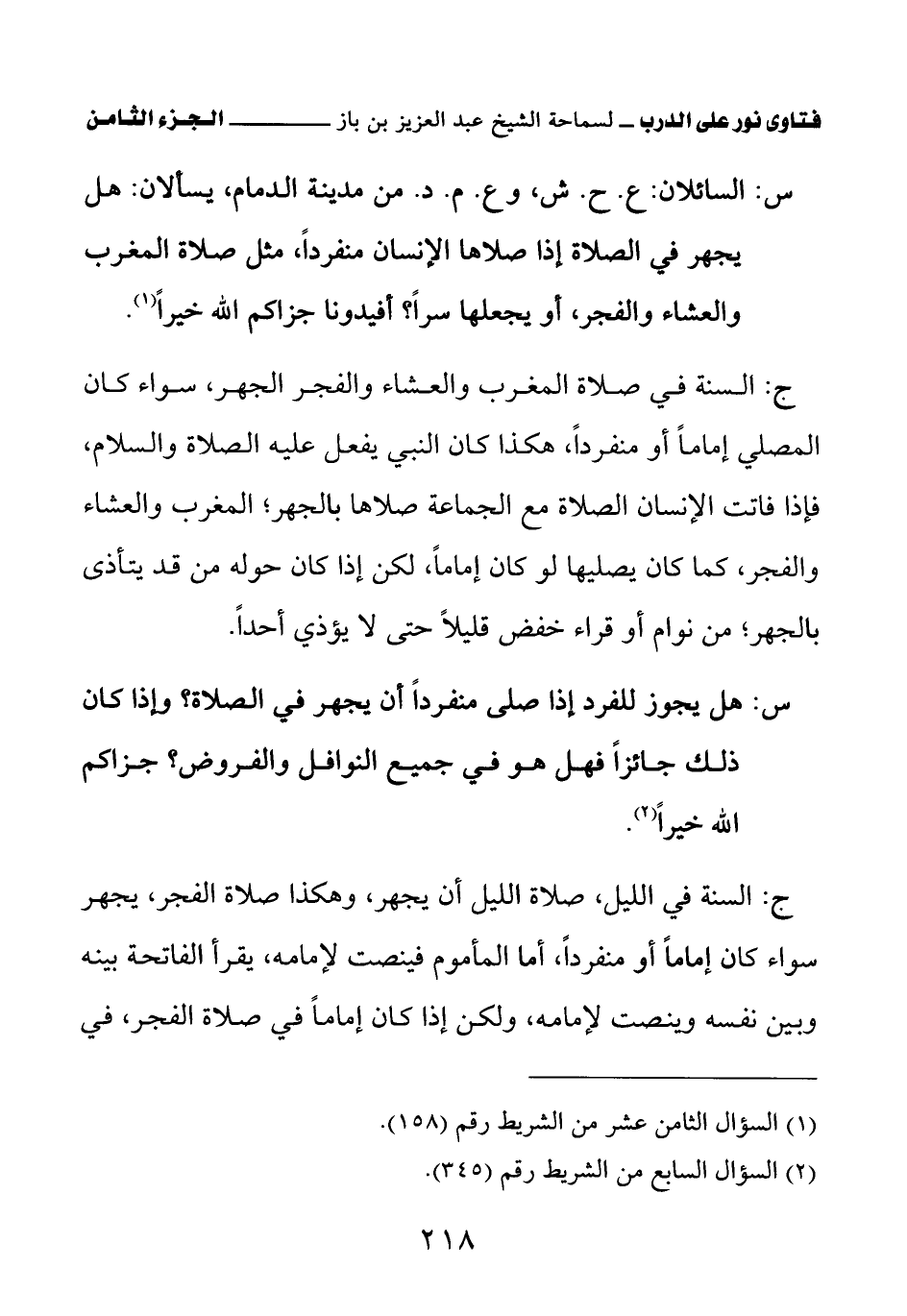 س: السائلان: ع. ح. ش، وع. م. د. من مدينة الدمام، يسألان: هل يجهر في الصلاة إذا صلاها الإنسان منفردا، مثل صلاة المغرب والعشاء والفجر، أو يجعلها سرا؟ أفيدونا جزاكم الله خيرا (¬1)