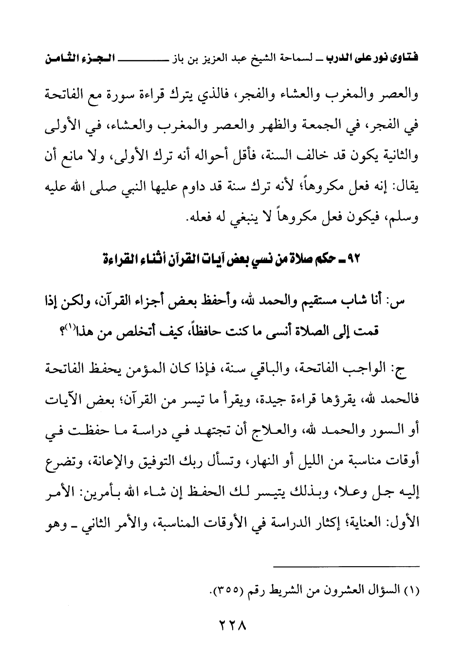 92 - حكم صلاة من نسي بعض آيات القرآن أثناء القراءة