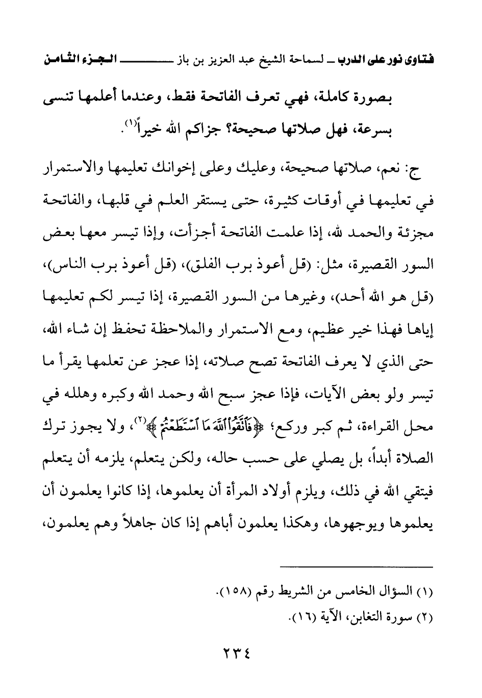 ج: نعم صلاتها صحيحة، وعليك وعلى أخوانك تعليمها والاستمرار في تعليمها في أوقات كثيرة، حتى يستقر العلم في قلبها، والفاتحة مجزئة والحمد لله، إذا علمت الفاتحة أجزأت، وإذا تيسر معها بعض السور القصيرة، مثل: (قل أعوذ برب الفلق) (قل أعوذ برب الناس) (قل هو الله أحد) وغيرها من السور القصيرة، إذا تيسر لكم تعليمها إياها فهذا خير عظيم، ومع الاستمرار والملاحظة تحفظ إن شاء الله، حتى الذي لا يعرف الفاتحة تصح صلاته، إذا عجز عن تعلمها يقرأ ما تيسر ولو بعض الآيات، فإذا عجز سبح الله وحمد الله وكبره وهلله في محل القراءة ثم كبر وركع؛ {فَاتَّقُوا اللَّهَ مَا اسْتَطَعْتُمْ} (¬2).