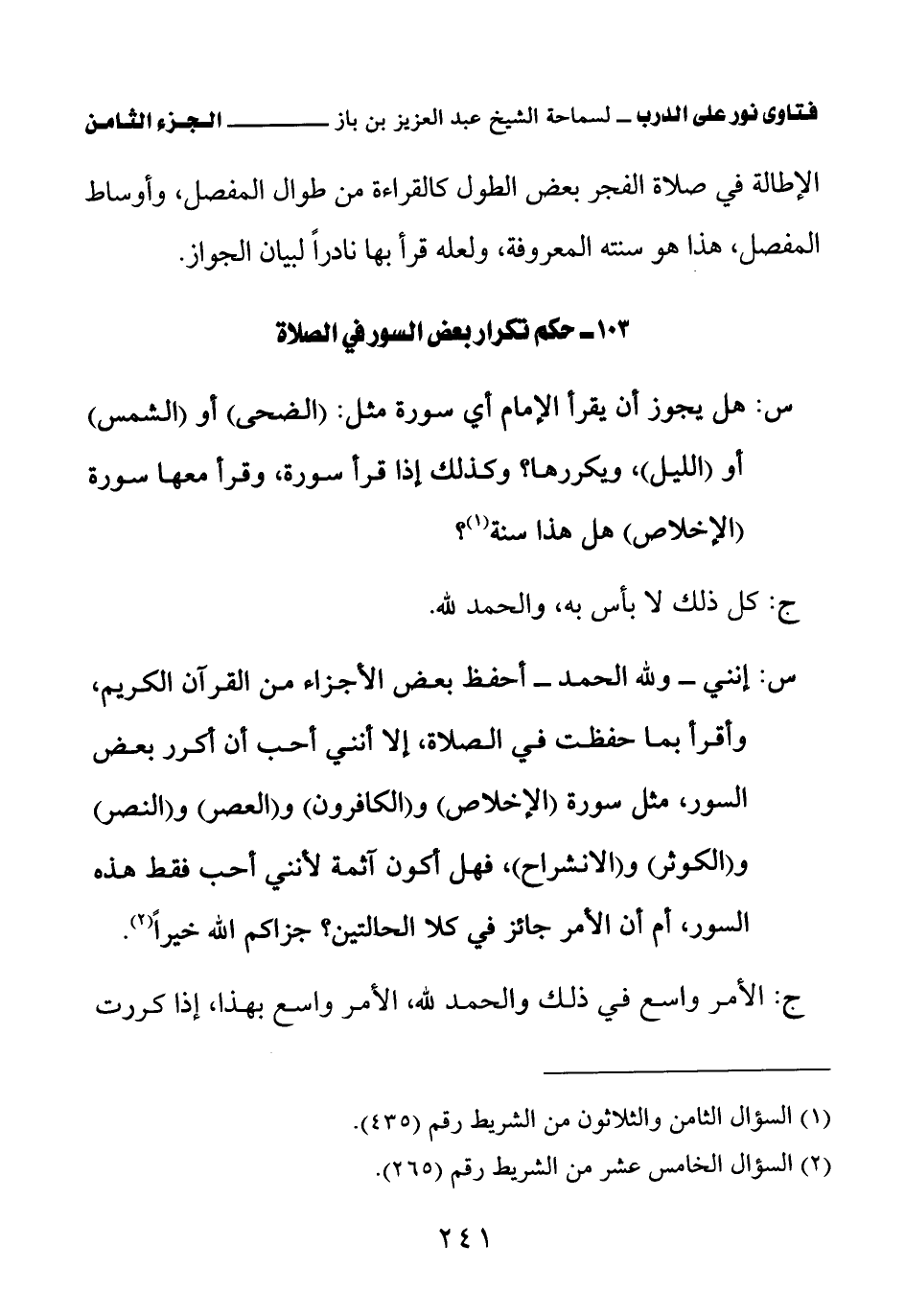 س: هل يجوز أن يقرأ الإمام أي سورة مثل: (الضحى) أو (الشمس) أو (الليل)، ويكررها، وكذلك إذا قرأ سورة، وقرأ معها سورة (الإخلاص) هل هذا سنة؟ (¬1)