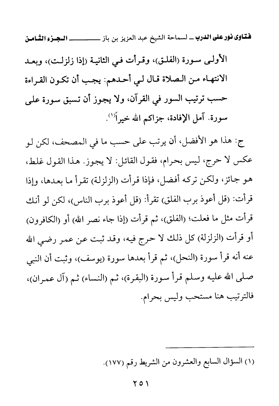 ج: هذا هو الأفضل، أن يرتب على حسب ما في المصحف، لكن لو عكس لا حرج، ليس بحرام، فقول القائل: لا يجوز. هذا القول غلط، هو جائز ولكن تركه أفضل، فإذا قرأت (الزلزلة) تقرأ ما بعدها، وإذا قرأت: (قل أعوذ برب الفلق) تقرأ: (قل أعوذ برب الناس)، لكن لو أنك قرأت مثل ما فعلت؛ (الفلق)، ثم قرأت (إذا جاء نصر الله) أو (الكافرون) أو قرأت (الزلزلة) كل ذلك لا حرج فيه، وقد ثبت عن عمر رضي الله عنه أنه قرأ سورة (النحل)، ثم قرأ بعدها سورة يوسف، وثبت أن النبي صلى الله عليه وسلم قرأ سورة (البقرة)، ثم (النساء) ثم (آل عمران)، فالترتيب هنا مستحب وليس بحرام.