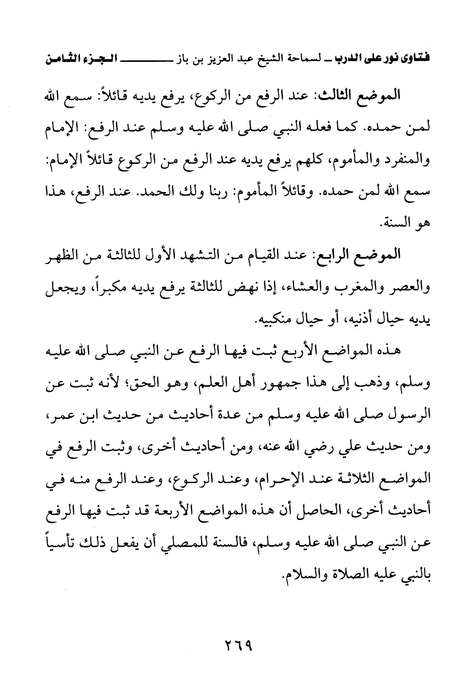 الموضع الرابع: عند القيام من التشهد الأول للثالثة من الظهر والعصر والمغرب والعشاء، إذا نهض للثالثة يرفع يديه مكبرا، ويجعل يديه حيال أذنيه، أو حيال منكبيه. هذه المواضع الأربع ثبت فيها الرفع عن النبي صلى الله عليه وسلم، وذهب إلى هذا جمهور أهل العلم، وهو الحق؛ لأنه ثبت عن الرسول صلى الله عليه وسلم من عدة أحاديث من حديث ابن عمر، ومن حديث علي رضي الله عنه، ومن أحاديث أخرى، وثبت الرفع في المواضع الثلاثة عند الإحرام، وعند الركوع، وعند الرفع منه في أحاديث أخرى، الحاصل أن هذه المواضع الأربعة قد ثبت فيها الرفع عن النبي صلى الله عليه وسلم، فالسنة للمصلي أن يفعل ذلك تأسيا بالنبي عليه الصلاة والسلام.