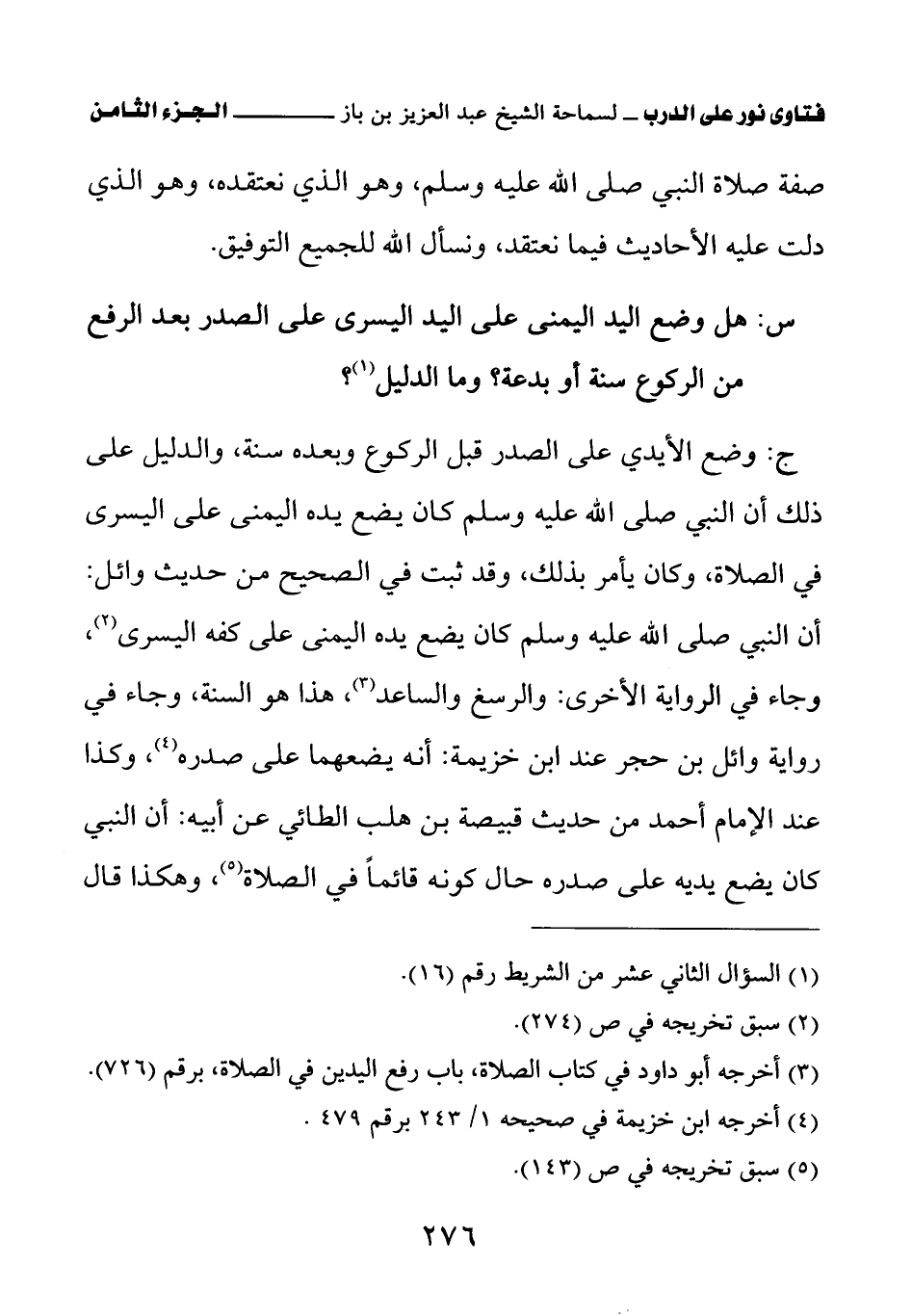 س: هل وضع اليد اليمنى على اليد اليسرى على الصدر بعد الرفع من الركوع سنة أو بدعة؟ وما الدليل؟ (¬1)