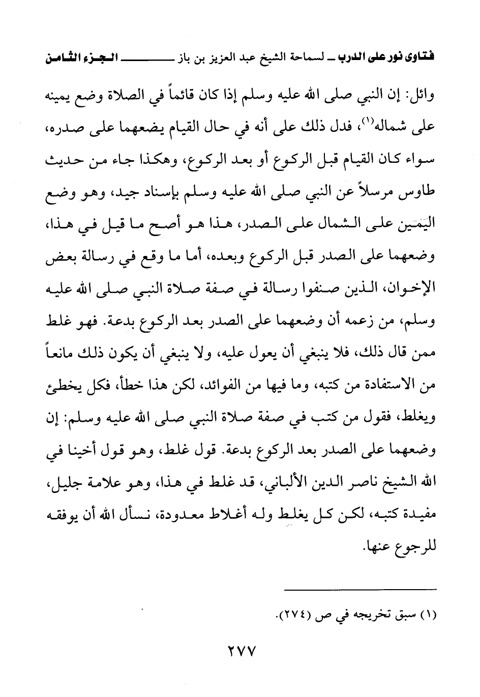 وائل: «إن النبي صلى الله عليه وسلم إذا كان قائما في الصلاة وضع يمينه على شماله (¬1)» فدل ذلك على أنه في حال القيام يضعهما على صدره، سواء كان القيام قبل الركوع أو بعد الركوع، وهكذا جاء من حديث طاوس مرسلا عن النبي صلى الله عليه وسلم بإسناد جيد، وهو وضع اليمين على الشمال على الصدر، هذا هو أصح ما قيل في هذا، وضعهما على الصدر قبل الركوع وبعده، أما ما وقع في رسالة بعض الإخوان، الذين صنفوا رسالة في صفة صلاة النبي صلى الله عليه وسلم، من زعمه أن وضعهما على الصدر بعد الركوع بدعة. فهو غلط ممن قال ذلك، فلا ينبغي أن يعول عليه، ولا ينبغي أن يكون ذلك مانعا من الاستفادة من كتبه، وما فيها من الفوائد، لكن هذا خطأ، فكل يخطئ ويغلط، فقول من كتب في صفة صلاة النبي صلى الله عليه وسلم: إن وضعهما على الصدر بعد الركوع بدعة قول غلط، وهو قول أخينا في الله الشيخ ناصر الدين الألباني، قد غلط في هذا، وهو علامة جليل، مفيدة كتبه، لكن كل يغلط وله أغلاط معدودة، نسأل الله أن يوفقه للرجوع عنها.