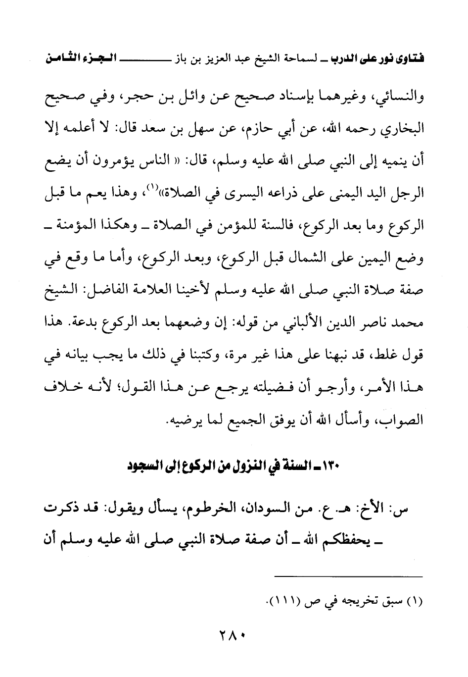 والنسائي، وغيرهما بإسناد صحيح عن وائل بن حجر، وفي صحيح البخاري رحمه الله، عن أبي حازم، عن سهل بن سعد قال: لا أعلمه إلا أن ينميه إلى النبي صلى الله عليه وسلم، قال: «كان الناس يؤمرون أن يضع الرجل اليد اليمنى على ذراعه اليسرى في الصلاة (¬1)» وهذا يعم ما قبل الركوع وما بعد الركوع، فالسنة للمؤمن في الصلاة – وهكذا المؤمنة – وضع اليمين على الشمال قبل الركوع، وبعد الركوع، وأما ما وقع في صفة صلاة النبي صلى الله عليه وسلم لأخينا العلامة الفاضل: الشيخ محمد ناصر الدين الألباني من قوله: إن وضعهما بعد الركوع بدعة. هذا قول غلط، قد نبهنا على هذا غير مرة، وكتبنا في ذلك ما يجب بيانه في هذا الأمر، وأرجو أن فضيلته يرجع عن هذا القول؛ لأنه خلاف الصواب، وأسأل الله أن يوفق الجميع لما يرضيه.