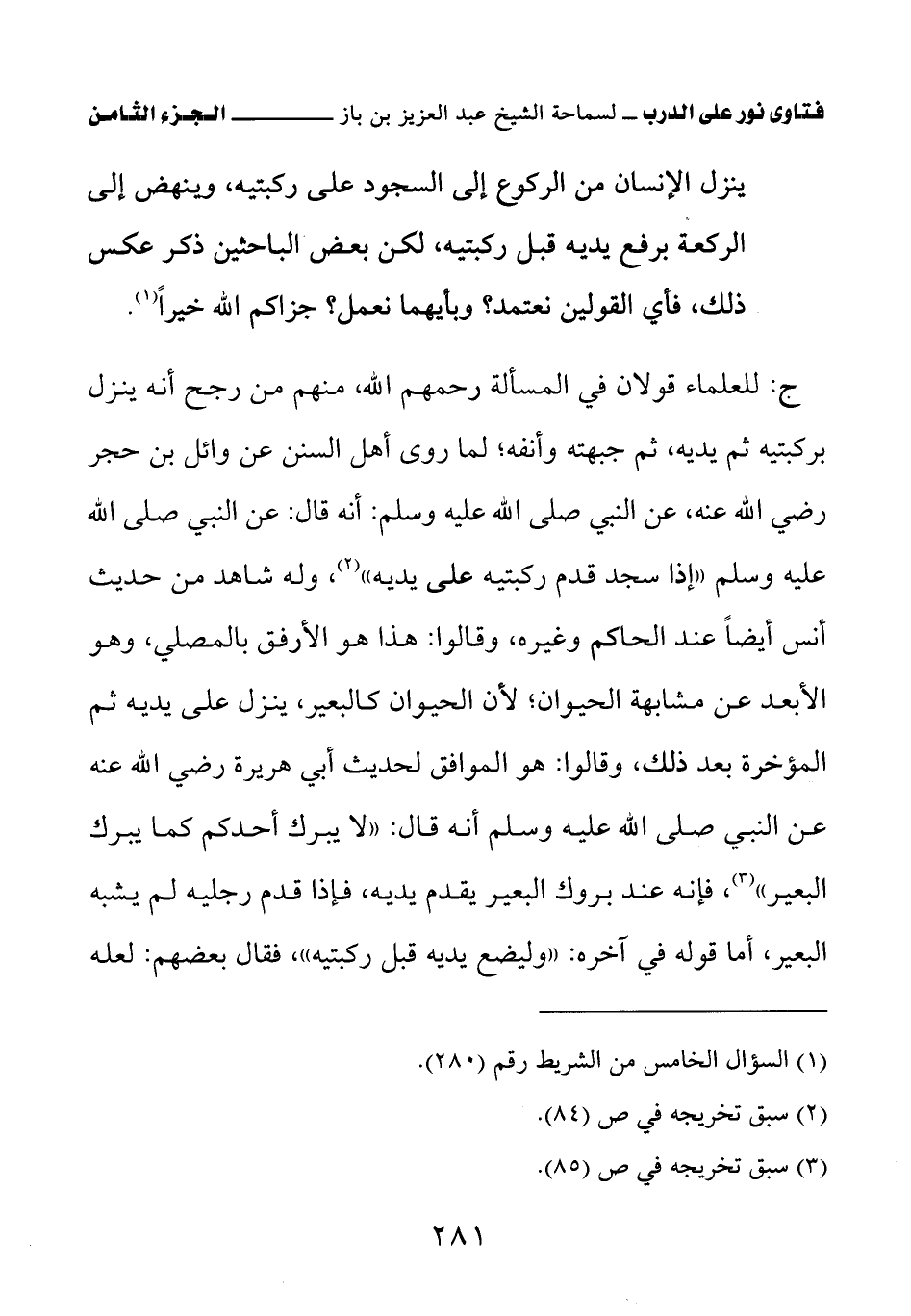 (¬3) أخرجه أبو داود في كتاب الصلاة، كتاب تفريع استفتاح الصلاة، باب كيف يضع ركبتيه قبل يديه، برقم (840).