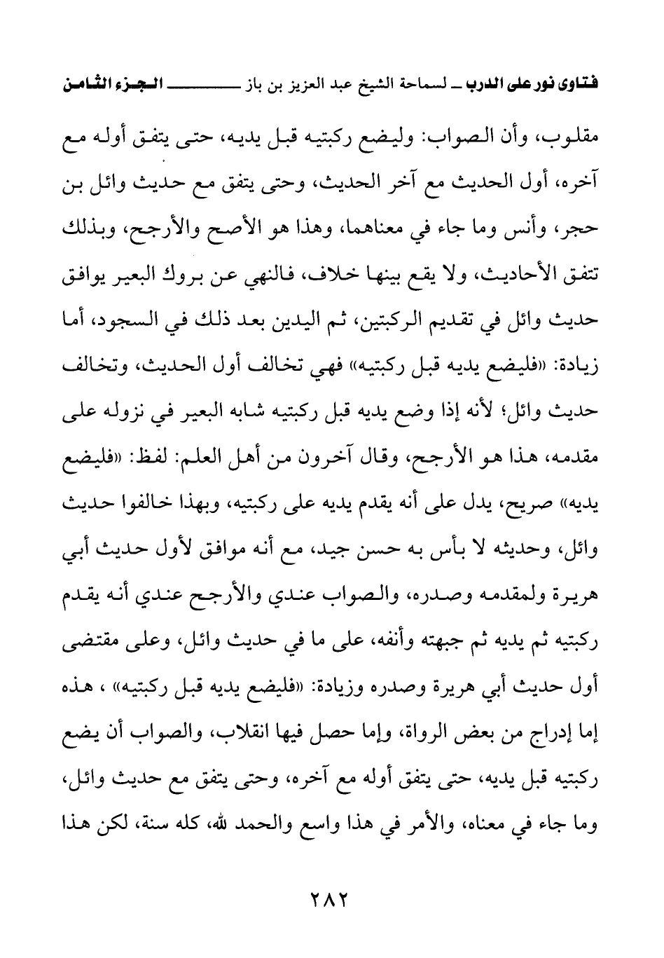 مقلوب وأن الصواب: وليضع ركبتيه قبل يديه، حتى يتفق أوله مع آخره، أول الحديث مع آخر الحديث، وحتى يتفق مع حديث وائل بن حجر، وأنس وما جاء في معناهما، وهذا هو الأصح والأرجح، وبذلك تتفق الأحاديث، ولا يقع بينها خلاف، فالنهي عن بروك البعير يوافق حديث وائل في تقديم الركبتين، ثم اليدين بعد ذلك في السجود، أما زيادة: «فليضع يديه قبل ركبتيه (¬1)» فهي تخالف أول الحديث، وتخالف حديث وائل؛ لأنه إذا وضع يديه قبل ركبتيه شابه البعير في نزوله على مقدمه، هذا هو الأرجح، وقال آخرون من أهل العلم: لفظ: «فليضع يديه (¬2)» صريح، يدل على أنه يقدم يديه على ركبتيه، وبهذا خالفوا حديث وائل، وحديثه لا بأس به حسن جيد، مع أنه موافق لأول حديث أبي هريرة ولمقدمه وصدره، والصواب عندي والأرجح عندي أنه يقدم ركبتيه ثم يديه ثم جبهته وأنفه، على ما في حديث وائل، وعلى مقتضى أول حديث أبي هريرة وصدره وزيادة: «فليضع يديه قبل ركبتيه (¬3)»، هذه إما إدراج من بعض الرواة، وإما حصل فيها انقلاب، والصواب أن يضع ركبتيه قبل يديه، حتى يتفق أوله مع آخره، وحتى يتفق مع حديث وائل وما جاء في معناه، والأمر في هذا واسع والحمد لله كله سنة، لكن هذا