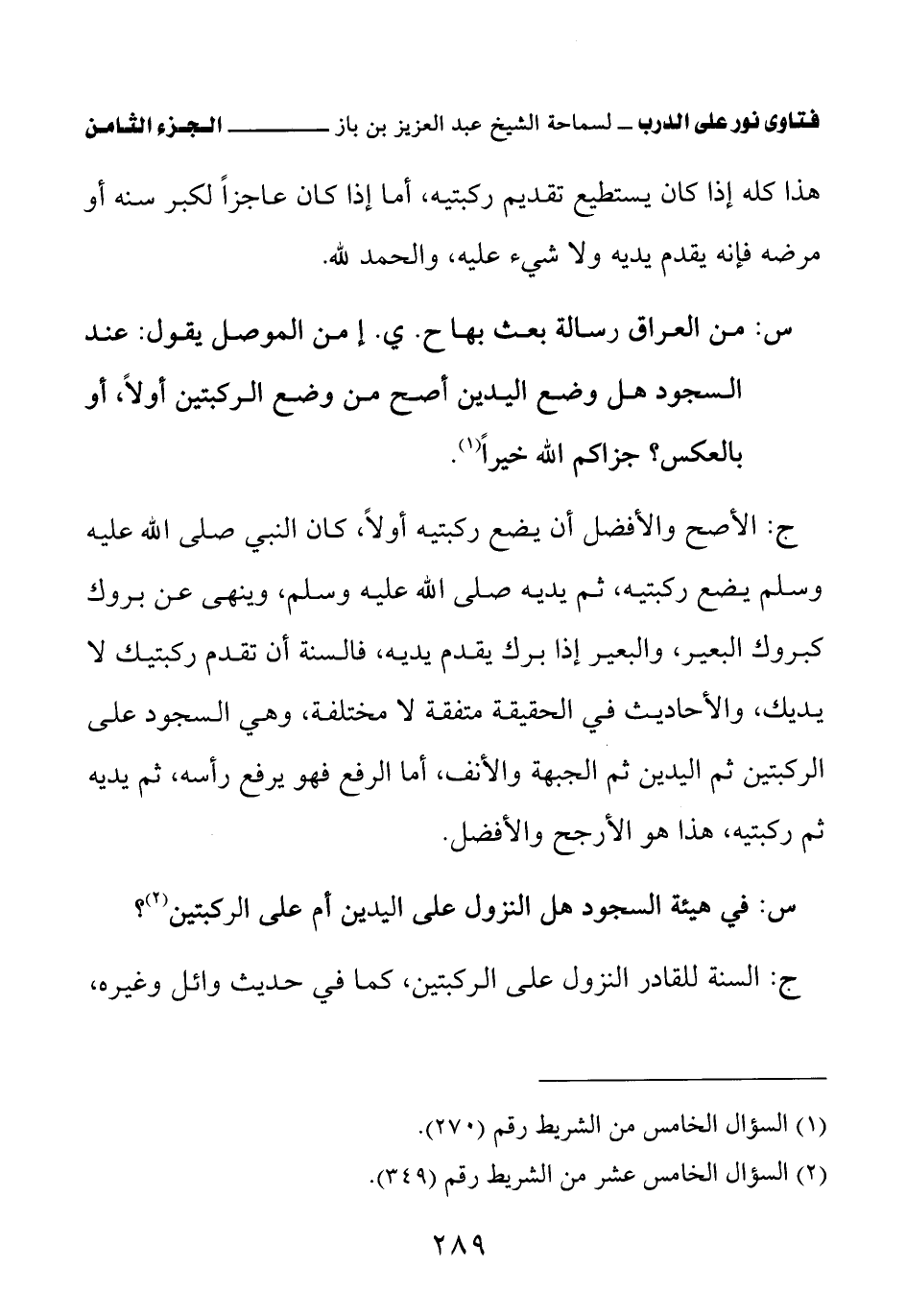 س: من العراق رسالة بعث بها ح. ي. إ من الموصل يقول: عند السجود هل وضع اليدين أصح من وضع الركبتين أولا، أو بالعكس؟ جزاكم الله خيرا (¬1)