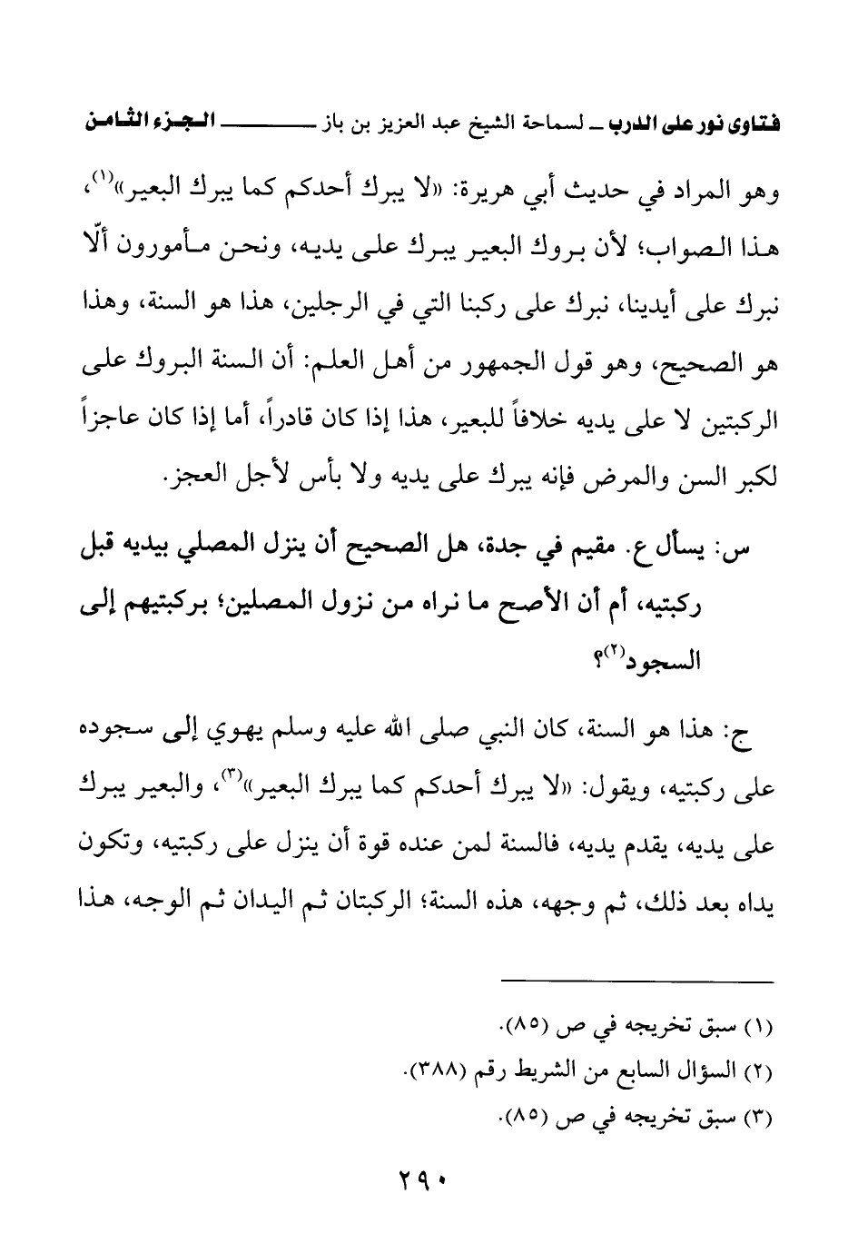 وهو المراد في حديث أبي هريرة: «لا يبرك أحدكم كما يبرك البعير (¬1)» هذا الصواب؛ لأن بروك البعير يبرك على يديه، ونحن مأمورون ألا نبرك على أيدينا، نبرك على ركبنا التي في الرجلين، هذا هو السنة، وهذا هو الصحيح، وهو قول الجمهور من أهل العلم: أن السنة البروك على الركبتين لا على يديه خلافا للبعير، هذا إذا كان قادرا، أما إذا كان عاجزا لكبر السن والمرض فإنه يبرك على يديه ولا بأس لأجل العجز.
