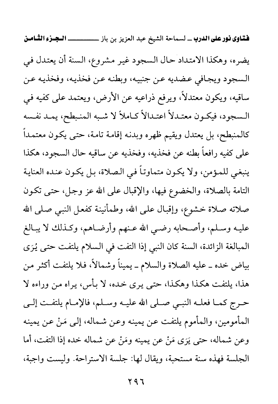 وكذلك لا يبالغ المبالغة الزائدة، السنة كان النبي إذا التفت في السلام حتى يرى بياض خده - عليه الصلاة والسلام – يمينا وشمالا، فلا يلتفت أكثر من هذا، يلتفت هكذا وهكذا، حتى يرى خده، لا بأس، يراه من وراءه لا حرج كما فعله النبي صلى الله عليه وسلم، فالإمام يلتفت إلى المأمومين، والمأموم يلتفت عن يمينه وعن شماله، إلى من عن يمينه وعن شماله، حتى يرى من عن يمينه ومن عن شماله خده إذا التفت، أما الجلسة فهذه سنة مستحبة، ويقال لها: جلسة الاستراحة. وليست واجبة