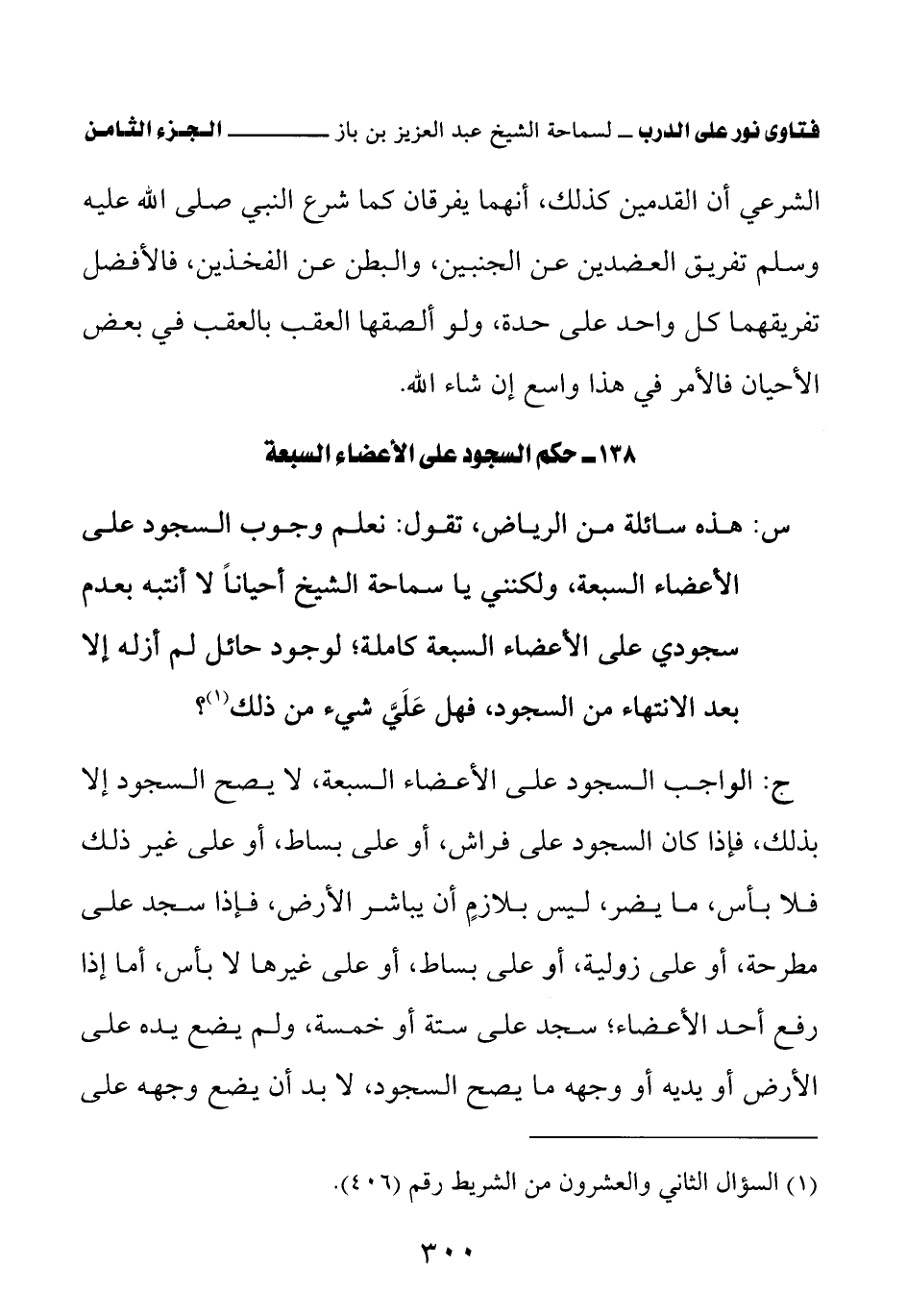 س: هذه سائلة من الرياض، تقول: نعلم وجوب السجود على الأعضاء السبعة، ولكنني يا سماحة الشيخ أحيانا لا أنتبه بعدم سجودي على الأعضاء السبعة كاملة؛ لوجود حائل لم أزله إلا بعد الانتهاء من السجود، فهل علي شيء من ذلك؟ (¬1)