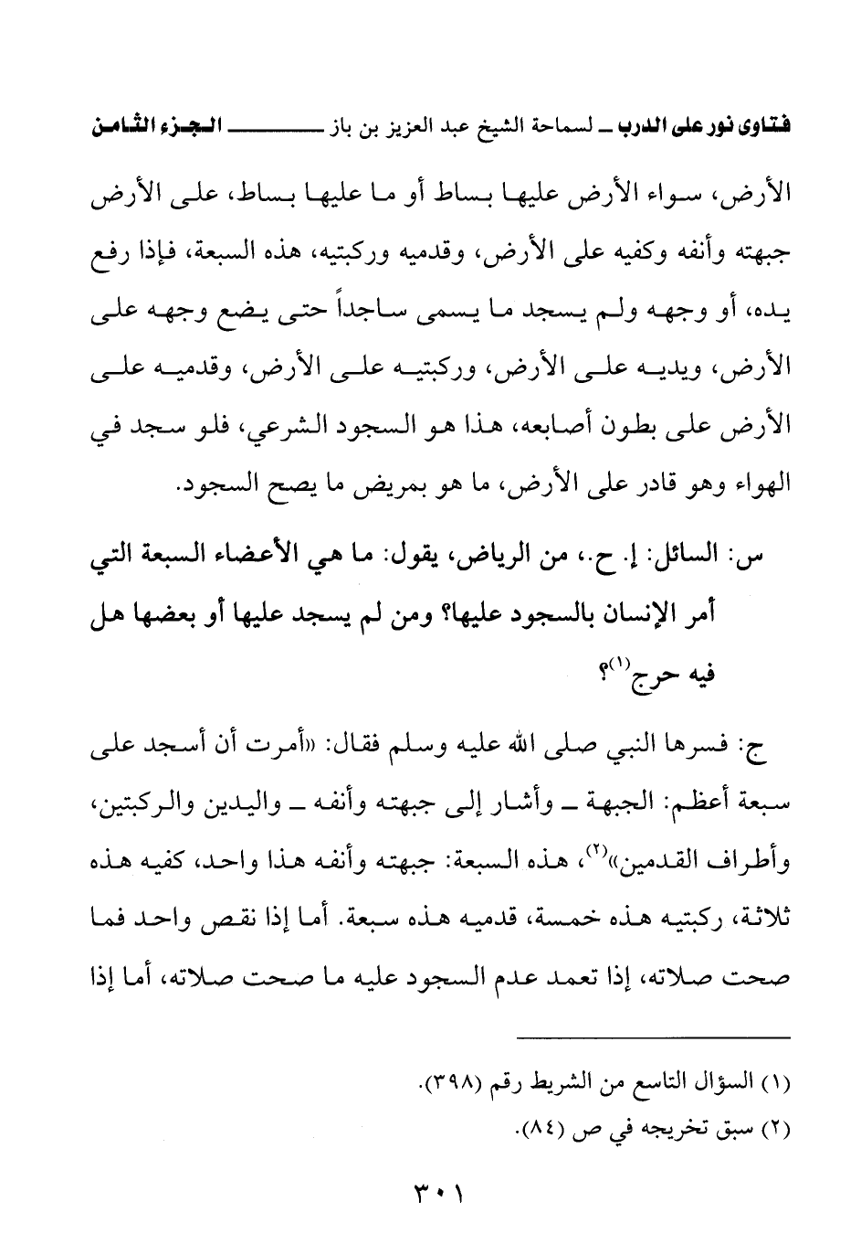 ج: فسرها النبي صلى الله عليه وسلم فقال: «أمرت أن أسجد على سبعة أعظم: الجبهة – وأشار إلى جبهته وأنفه – واليدين والركبتين، وأطراف القدمين (¬2)» هذه السبعة: جبهته وأنفه هذا واحد، كفيه هذه ثلاثة، ركبتيه هذه خمسة، قدميه هذه سبعة.