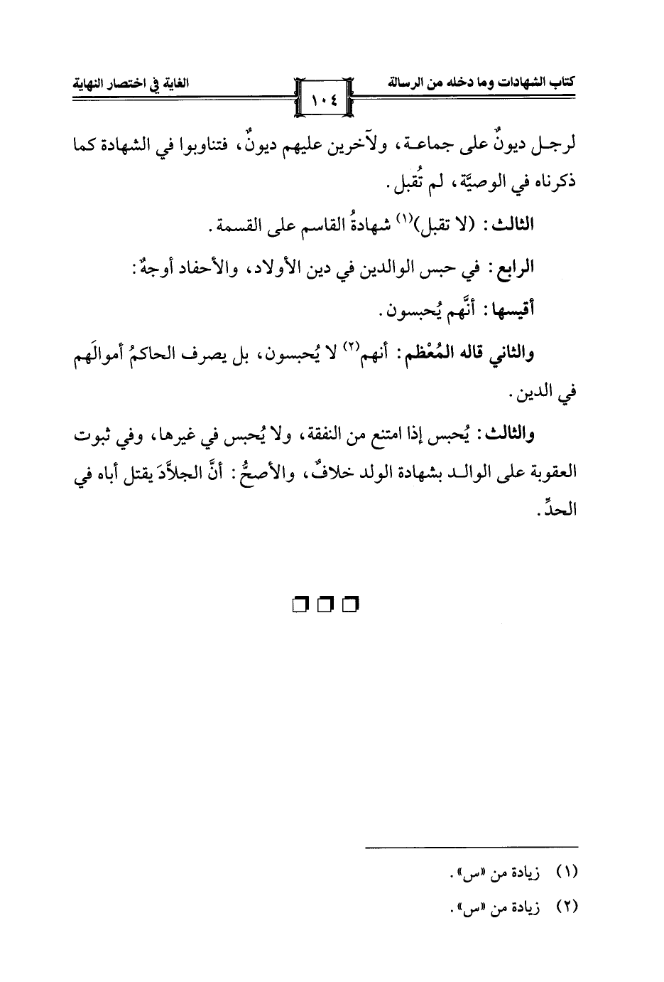 والثالث: يُحبس إذا امتنع من النفقة، ولا يُحبس في غيرها، وفي ثبوت العقوبة على الوالد بشهادة الولد خلافٌ، والأصحُّ: أنَّ الجلَّادَ يقتل أباه في الحدِّ.