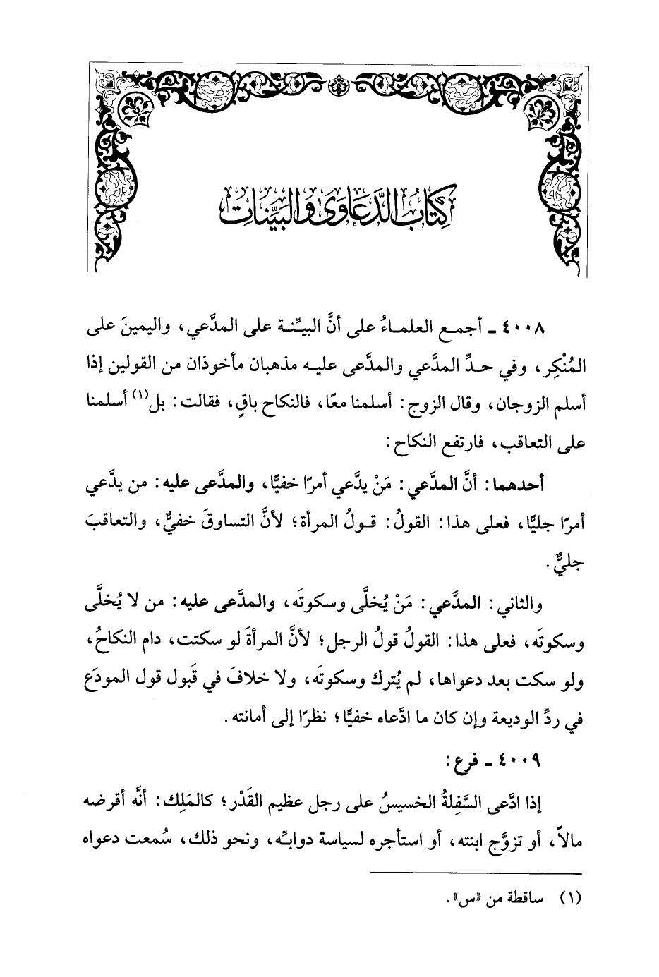 4008 - أجمع العلماءُ على أن البيِّنة على المدَّعي، واليمينَ على المُنْكِر، وفي حدِّ المدَّعي والمدَّعى عليه مذهبان مأخوذان من القولين إذا أسلم الزوجان, وقال الزوج: أسلمنا معًا، فالنكاح باقٍ، فقالت: بل (¬1) أسلمنا على التعاقب، فارتفع النكاح: