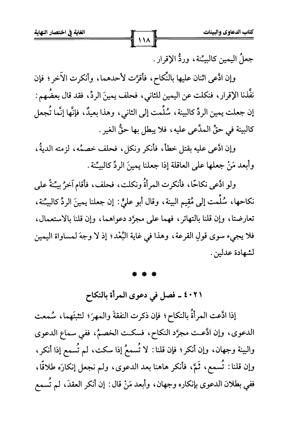 ولو ادَّعى نكاحًا، فأنكرت المرأةُ ونكلت، فحلف، فأقام آخرُ بيِّنةً على نكاحها، سُلِّمت إلى مُقِيم البينة, وقال أبو على: إن جعلنا يمينَ الردِّ كالبيِّنة، تعارضتا، وإن قلنا بالتهاتر، فهما على مجرَّد دعواهما، وإن قلنا بالاستعمال، فلا يجيء سوى قولِ القرعة، وهذا في غاية البُعْد؛ إذ لا وجهَ لمساواة اليمين لشهادة عدلين.