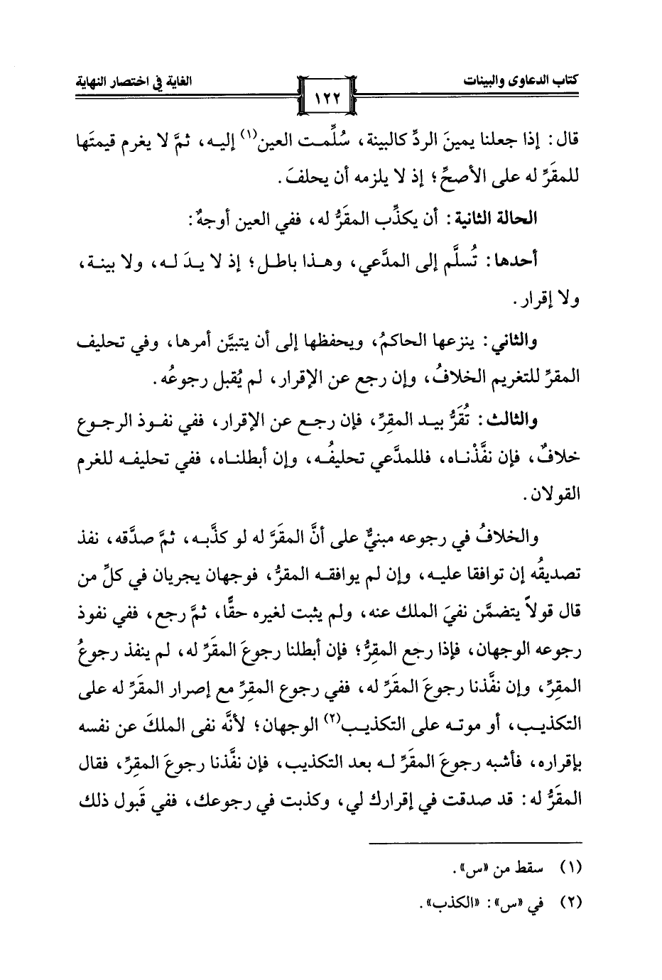 والخلافُ في رجوعه مبنيٌّ على أنَّ المقَرَّ له لو كذَّبه، ثمَّ صدَّقه، نفذ تصديقُه إن توافقا عليه، وإن لم يوافقه المقرُّ، فوجهان يجريان في كلِّ من قال قولًا يتضمَّن نفيَ الملك عنه، ولم يثبت لغيره حقُّا، ثمَّ رجع، ففي نفوذ رجوعه الوجهان، فإذا رجع المقِرُّ، فإن أبطلنا رجوعَ المقَرِّ له، لم ينفذ رجوعُ المقِرِّ، وإن نفَّذنا رجوعَ المقَرِّ له، ففي رجوع المقِرِّ مع إصرار المقَرِّ له على التكذيب، أو موته على التكذيب (¬2) الوجهان؛ لأنَّه نفى الملكَ عن نفسه بإقراره، فأشبه رجوعَ المقَرِّ له بعد التكذيب، فإن نفَذنا رجوعَ المقِرِّ، فقال المقَرُّ له: قد صدقت في إقرارك لي، وكذبت في رجوعك، ففي قَبول ذلك