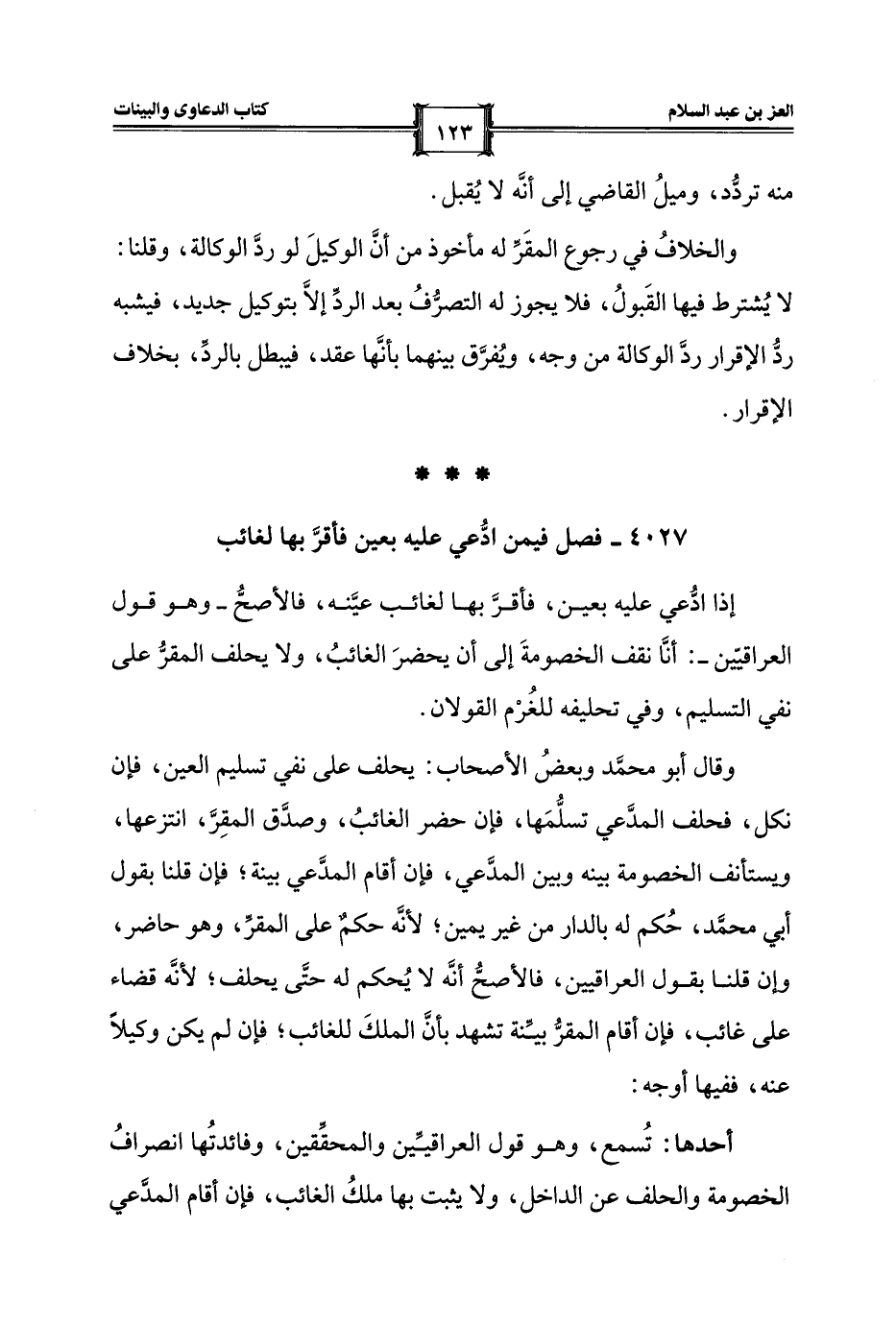 4027 - فصل فيمن ادُّعي عليه بعين فأقرَّ بها لغائب