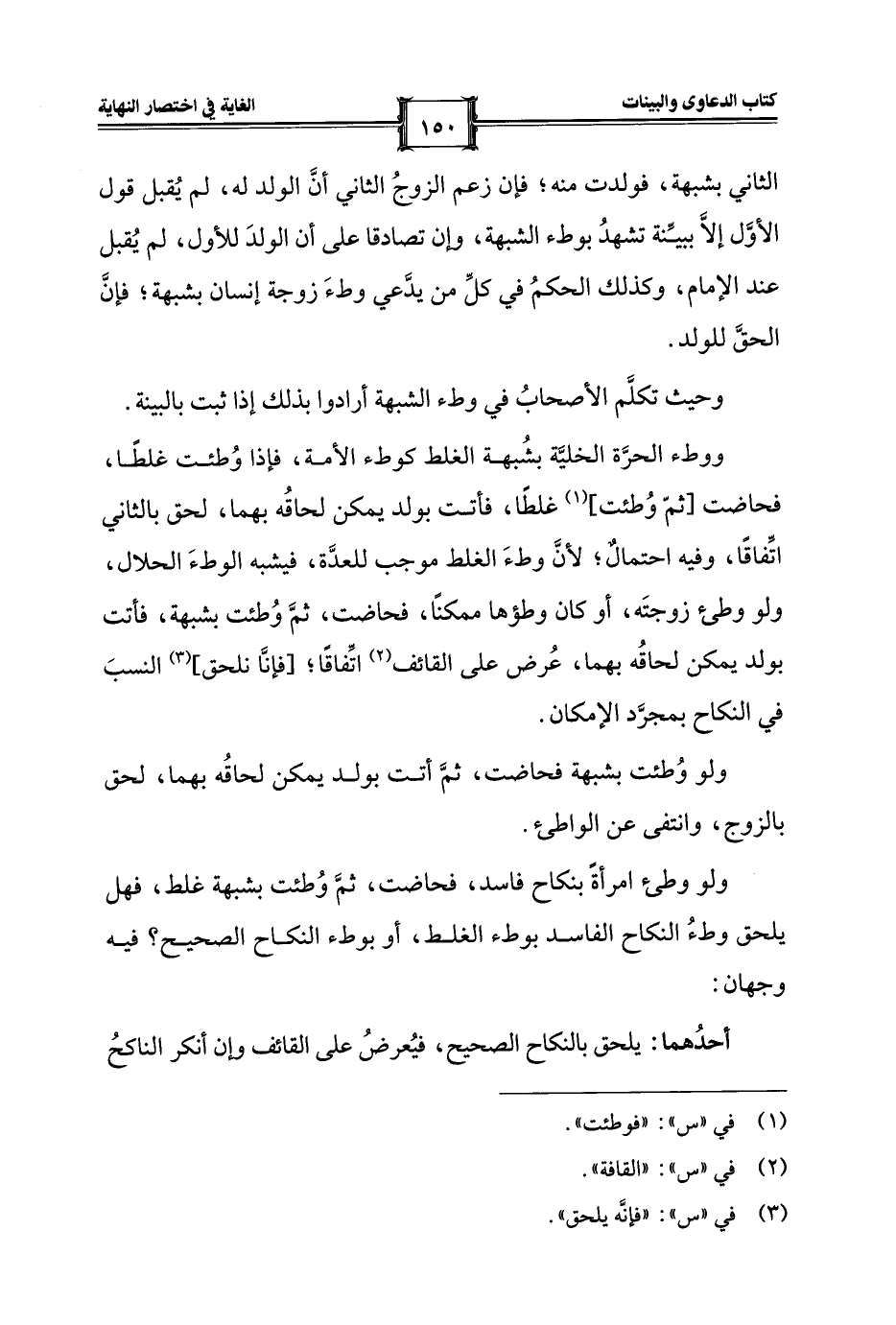 الثاني بشبهة، فولدت منه؛ فإن زعم الزوجُ الثاني أنَّ الولد له، لم يُقبل قول الأوَّل إلَّا ببيِّنة تشهدُ بوطء الشبهة، وإن تصادقا على أن الولدَ للأول، لم يُقبل عند الإمام، وكذلك الحكمُ في كلِّ من يدَّعي وطءَ زوجة إنسان بشبهة؛ فإنَّ الحقَّ للولد.