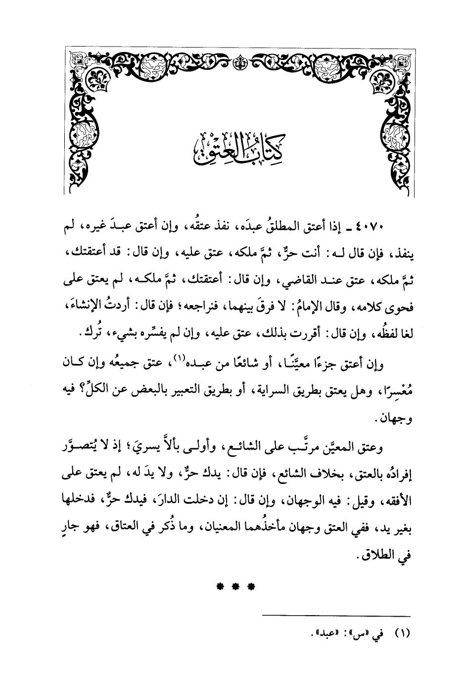 4070 - إذا أعتق المطلقُ عبدَه، نفذ عتقُه، وإن أعتق عبدَ غيره، لم ينفذ، فإن قال له: أنت حرٌّ، ثمَّ ملكه، عتق عليه، وإن قال: قد أعتقتك، ثمَّ ملكه، عتق عند القاضي، وإن قال: أعتقتك، ثمَّ ملكه، لم يعتق على فحوى كلامه، وقال الإمامُ: لا فرقَ بينهما، فنراجعه؛ فإن قال: أردتُ الإنشاءَ، لغا لفظُه، وإن قال: أقررت بذلك، عتق عليه، وإن لم يفسِّره بشيء، تُرك.