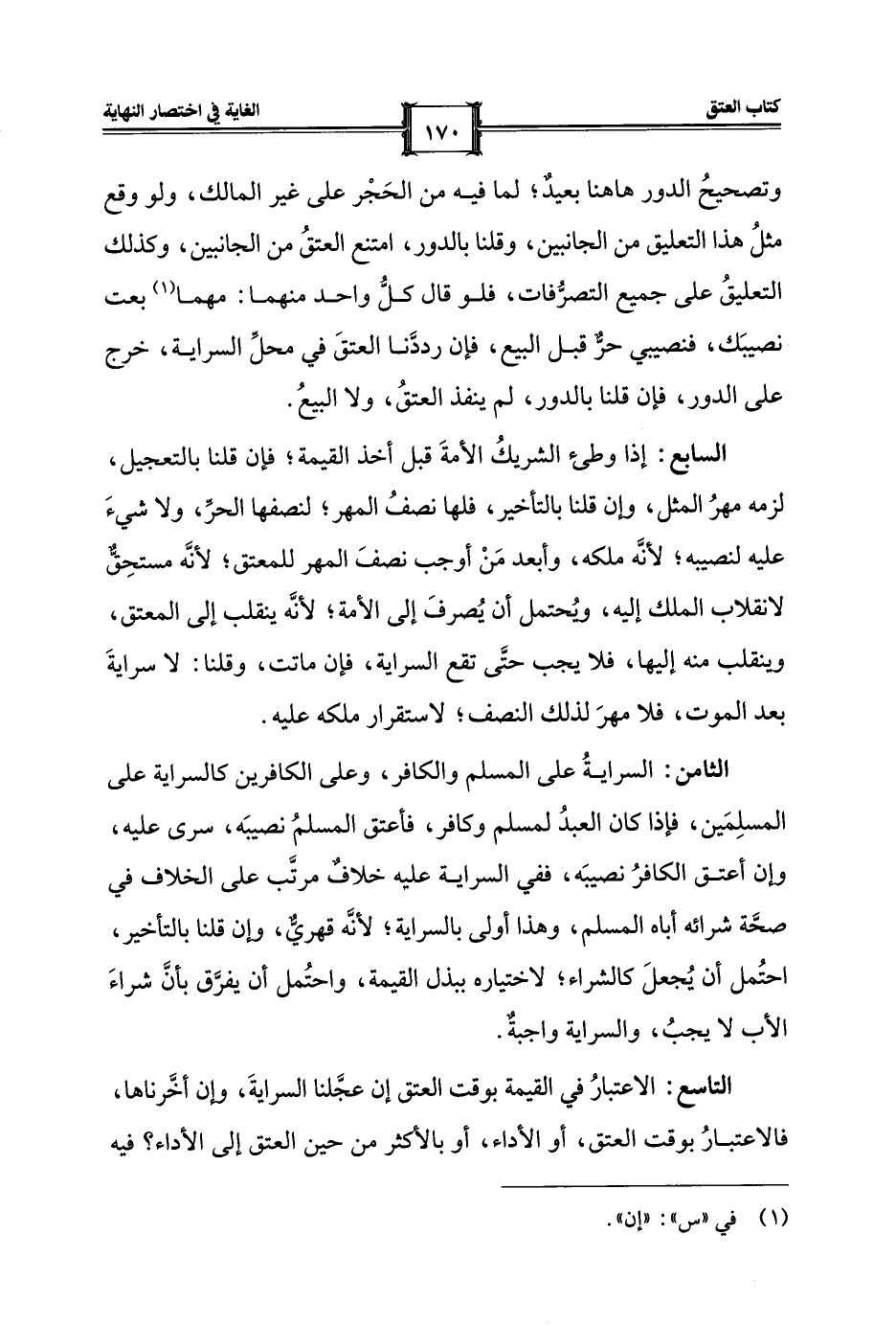 الثامن: السرايةُ على المسلم والكافر، وعلى الكافرين كالسراية على المسلِمَين، فإذا كان العبدُ لمسلم وكافر، فأعتق المسلمُ نصيبَه، سرى عليه، وإن أعتق الكافرُ نصيبَه، ففي السراية عليه خلافٌ مرتَّب على الخلاف في صحَّة شرائه أباه المسلم، وهذا أولى بالسراية؛ لأنَّه قهريٌّ، وإن قلنا بالتأخير، احتُمل أن يُجعلَ كالشراء؛ لاختياره ببذل القيمة، واحتُمل أن يفرَّق بأنَّ شراءَ الأب لا يجبُ، والسراية واجبةٌ.