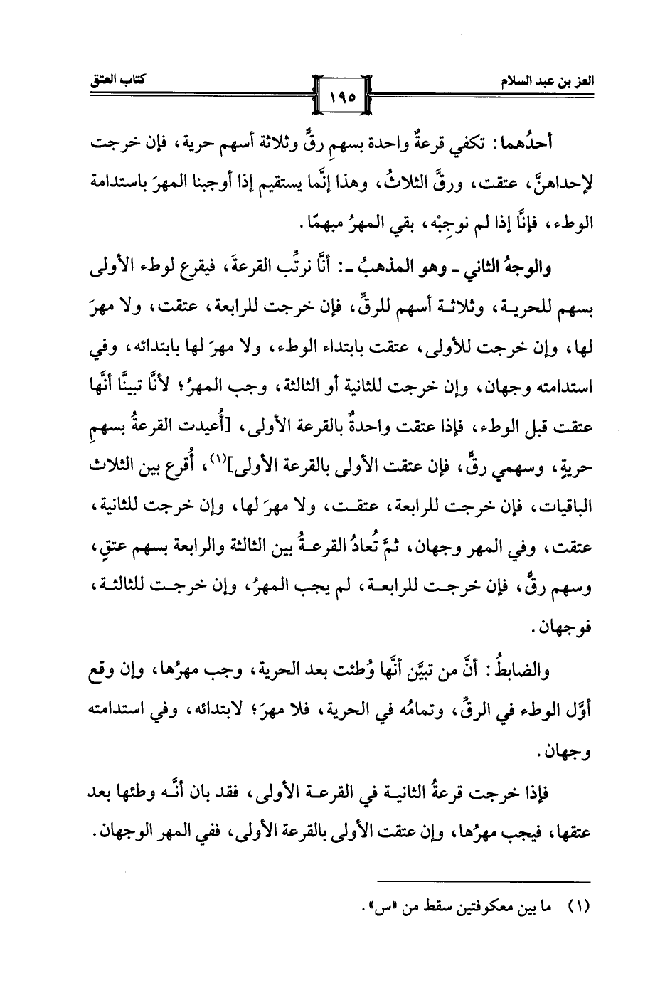 والوجهُ الثاني -وهو المذهبُ-: أنَّا نرتِّب القرعةَ، فيقرع لوطء الأولى بسهم للحرية، وثلاثة أسهم للرقِّ، فإن خرجت للرابعة، عتقت، ولا مهرَ لها، وإن خرجت للأولى، عتقت بابتداء الوطء، ولا مهرَ لها بابتدائه، وفي استدامته وجهان، وإن خرجت للثانية أو الثالثة، وجب المهرُ؛ لأنَّا تبينَّا أنَّها عتقت قبل الوطء، فإذا عتقت واحد بلا بالقرعة الأولى، [أُعيدت القرعةُ بسهمِ حريةٍ، وسهمي رقٍّ، فإن عتقت الأولى بالقرعة الأولى] (¬1)، أُقرع بين الثلاث الباقيات، فإن خرجت للرابعة، عتقت، ولا مهرَ لها، وإن خرجت للثانية، عتقت، وفي المهر وجهان، ثمَّ تُعادُ القرعةُ بين الثالثة والرابعة بسهم عتقٍ، وسهم رقٍّ، فإن خرجت للرابعة، لم يجب المهرُ، وإن خرجت للثالثة، فوجهان.