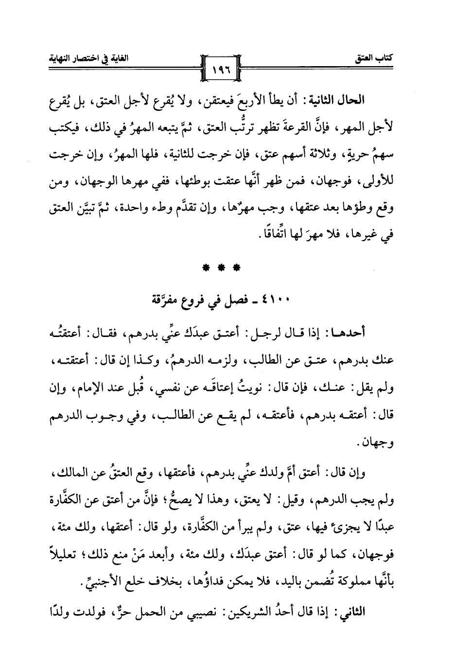 وإن قال: أعتق أمَّ ولدك عنِّي بدرهم، فأعتقها، وقع العتقُ عن المالك، ولم يجب الدرهم، وقيل: لا يعتق، وهذا لا يصحُّ؛ فإنَّ من أعتق عن الكفَّارة عبدًا لا يجزئ فيها، عتق، ولم يبرأ من الكفَّارة، ولو قال: أعتقها، ولك مئة، فوجهان، كما لو قال: أعتق عبدَك، ولك مئة، وأبعد مَنْ منع ذلك؛ تعليلًا بأنَّها مملوكهَ تُضمن باليد، فلا يمكن فداؤُها، بخلاف خلع الأجنبيِّ.