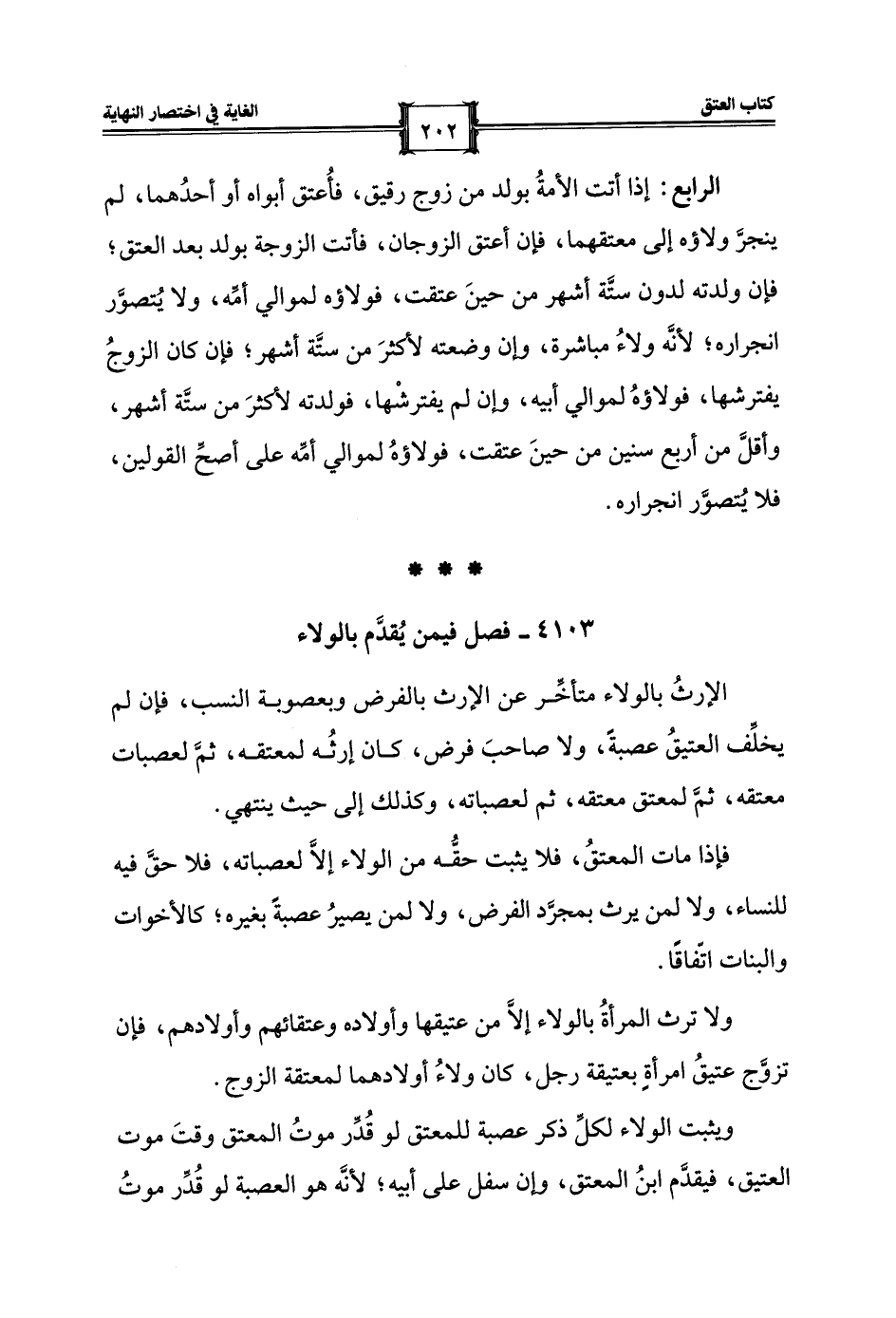 الإرثُ بالولاء متأخِّر عن الإرث بالفرض وبعصوبة النسب، فإن لم يخلِّف العتيقُ عصبةً، ولا صاحبَ فرض، كان إرثُه لمعتقه، ثمَّ لعصبات معتقه، ثمَّ لمعتق معتقه، ثم لعصباته، وكذلك إلى حيث ينتهي.