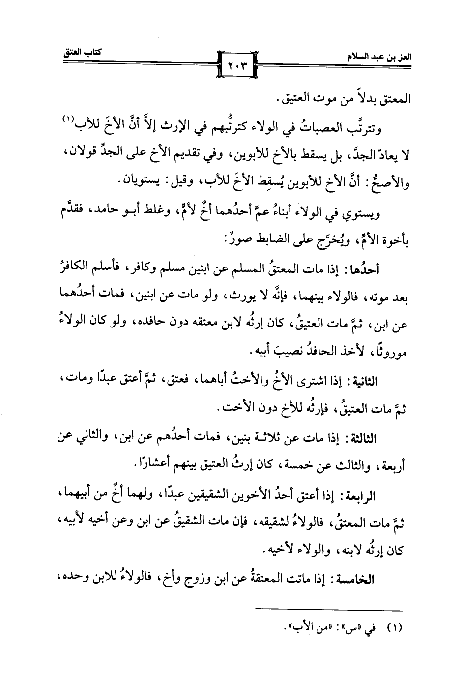 الرابعة: إذا أعتق أحدُ الأخوين الشقيقين عبدًا، ولهما أخٌ من أبيهما، ثمَّ مات المعتقُ، فالولاءُ لشقيقه، فإن مات الشقيقُ عن ابن وعن أخيه لأبيه، كان إرثُه لابنه، والولاء لأخيه.