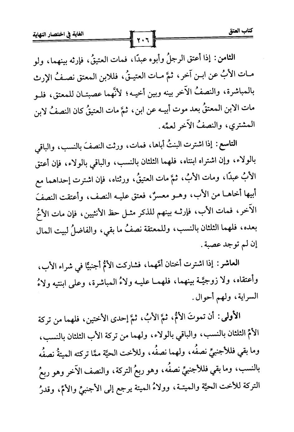 الثامن: إذا أعتق الرجلُ وأبوه عبدًا، فمات العتيقُ، فإرثه بينهما، ولو مات الأبُ عن ابن آخر، ثمَّ مات العتيقُ، فللابن المعتق نصفُ الإرث بالمباشرة، والنصفُ الآخر بينه وبين أخيه؛ لأنَّهما عصبتان للمعتق، فلو مات الابن المعتقُ بعد موت أبيه عن ابن، ثمَّ مات العتيقُ كان النصفُ لابن المشتري، والنصفُ الآخر لعمِّه.