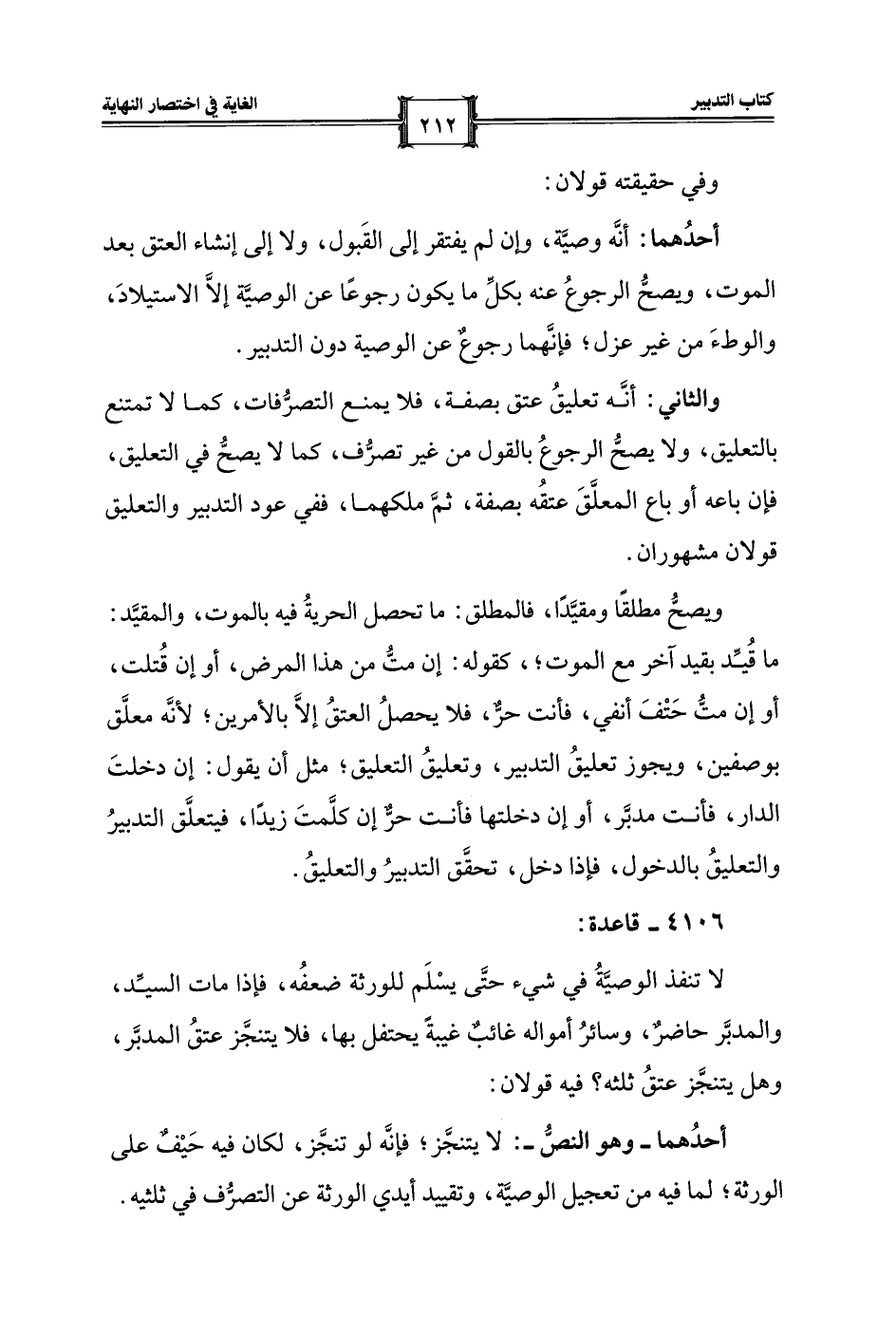 ويصحُّ مطلقًا ومقيَّدًا، فالمطلق: ما تحصل الحريةُ فيه بالموت، والمقيَّد: ما قُيِّد بقيد آخر مع الموت؛ ، كقوله: إن متُّ من هذا المرض، أو إن قُتلت، أو إن متُّ حَتْفَ أنفي، فأنت حرٌّ، فلا يحصلُ العتقُ إلَّا بالأمرين؛ لأنَّه معلَّق بوصفين، ويجوز تعليقُ التدبير، وتعليقُ التعليق؛ مثل أن يقول: إن دخلتَ الدار، فأنت مدبَّر، أو إن دخلتها فأنت حرٌّ إن كلَّمتَ زيدًا، فيتعلَّق التدبيرُ والتعليقُ بالدخول، فإذا دخل، تحقَّق التدبيرُ والتعليقُ.