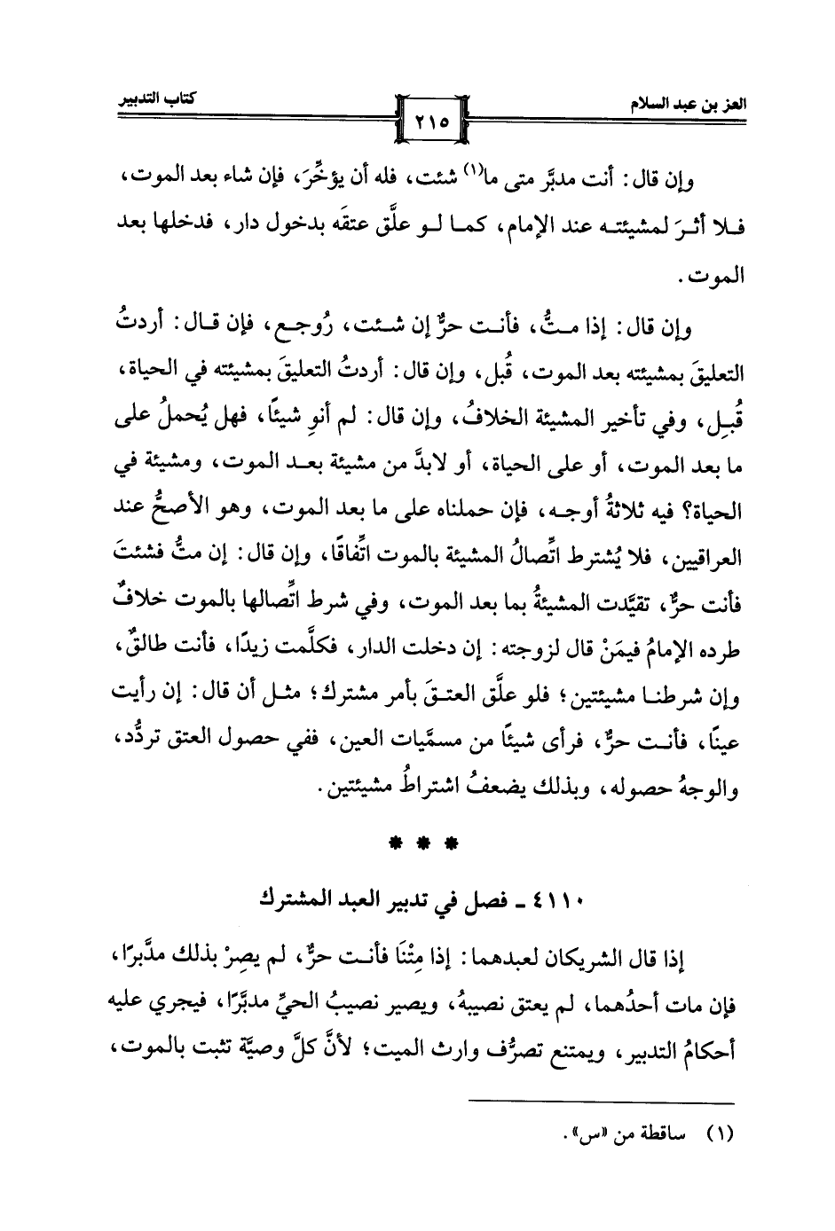 وإن قال: إذا متُّ، فأنت حرٌّ إن شئت، رُوجع، فإن قال: أردتُ التعليقَ بمشيئته بعد الموت، قُبل، وإن قال: أردتُ التعليقَ بمشيئته في الحياة، قُبِل، وفي تأخير المشيئة الخلافُ، وإن قال: لم أنوِ شيئًا، فهل يُحملُ على ما بعد الموت، أو على الحياة، أو لابدَّ من مشيئة بعد الموت، ومشيئة في الحياة؛ فيه ثلاثةُ أوجه، فإن حملناه على ما بعد الموت، وهو الأصحُّ عند العراقيين، فلا يُشترط اتِّصالُ المشيئة بالموت اتِّفاقًا، وإن قال: إن متُّ فشئتَ فأنت حرٌّ، تقيَّدت المشيئةُ بما بعد الموت، وفي شرط اتِّصالها بالموت خلافٌ طرده الإمامُ فيمَنْ قال لزوجته: إن دخلت الدار، فكلَّمت زيدًا، فأنت طالقٌ، وإن شرطنا مشيئتين؛ فلو علَّق العتقَ بأمر مشترك؛ مثل أن قال: إن رأيت عينًا، فأنت حرٌّ، فرأى شيئًا من مسمَّيات العين، ففي حصول العتق تردُّد، والوجهُ حصوله، وبذلك يضعفُ اشتراطُ مشيئتين.