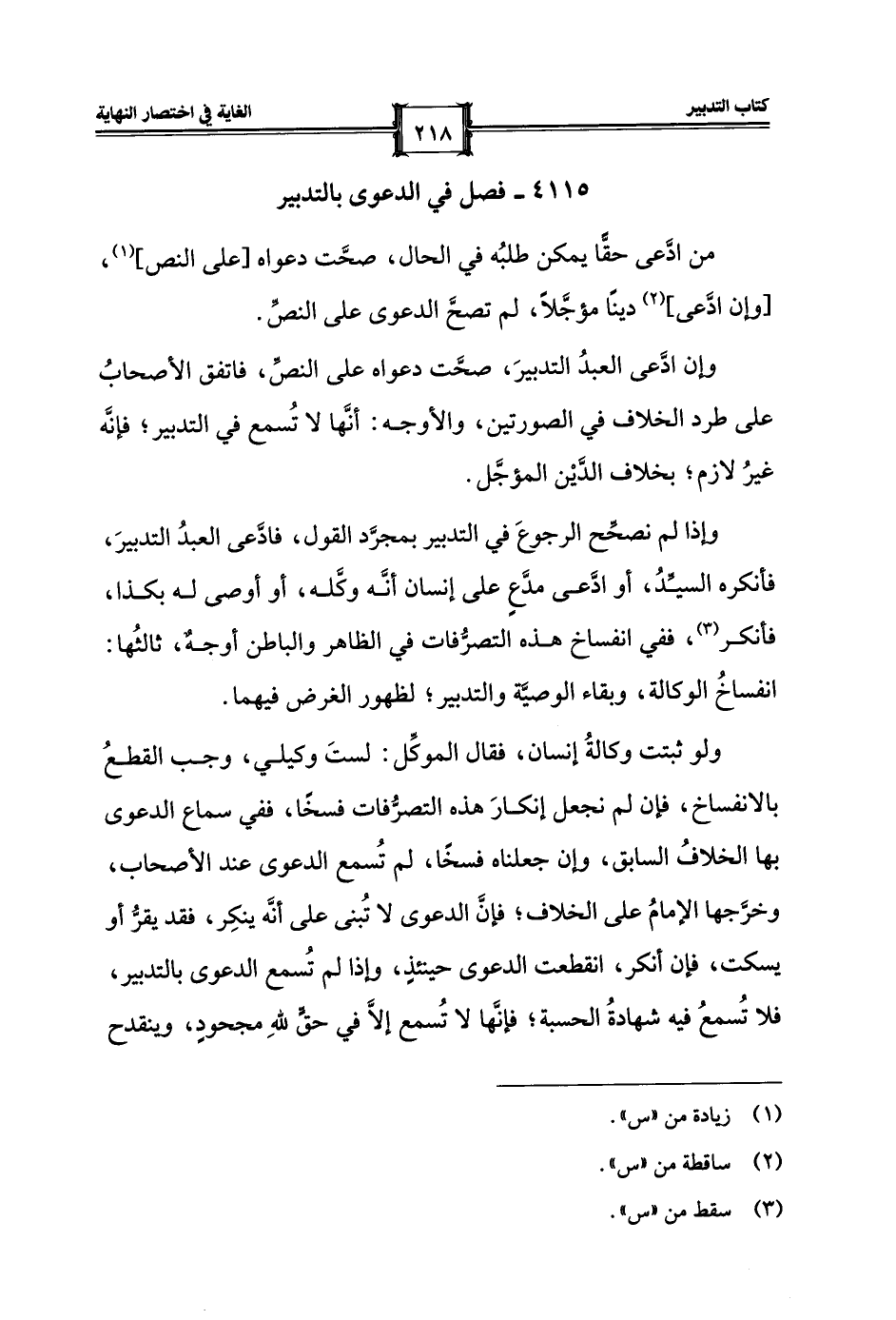 وإن ادَّعى العبدُ التدبيرَ، صحَّت دعواه على النصِّ، فاتفق الأصحابُ على طرد الخلاف في الصورتين، والأوجه: أنَّها لا تُسمع في التدبير؛ فانَّه غيرُ لازم؛ بخلاف الدَّيْن المؤجَّل.