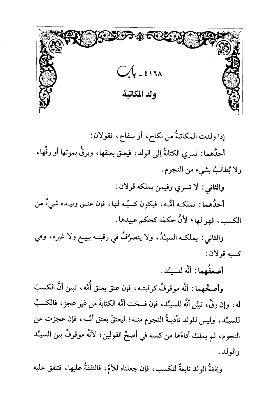 وأصحُّهما: أنَّه موقوفٌ كرقبته، فإن عتق بعتق أُمِّه، تبين أنَّ الكسبَ له، وإن رقَّ، تبيَّن أنَّه للسيِّد، فإن فسخت أمُّه الكتابةَ من غير عجز، فالكسبُ للسيِّد، وليس للولد تأديةُ النجوم منه؛ ليعتقَ بعتق أمِّه، فإن عجزت عن النجوم، لم يملك أداءَها من كسبه في أصحِّ القولين؛ لأنَّه موقوفٌ بين السيِّد والولد.