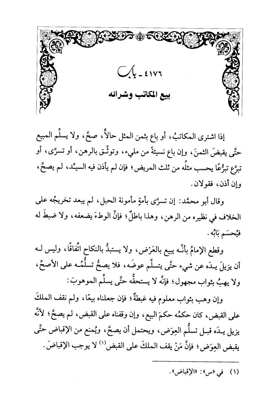 إذا اشترى المكاتبُ، أو باع بثمن المثل حالًّا، صحَّ، ولا يسلِّم المبيع حتَّى يقبضَ الثمنَ، وإن باع نسيئةً من مليء، وتوثَّق بالرهن، أو تسرَّى، أو تبرَّع تبرُّعًا يحسب مثلُه من ثلث المريض؛ فإن لم يأذن فيه السيِّد، لم يصحَّ، وإن أذن، فقولان.