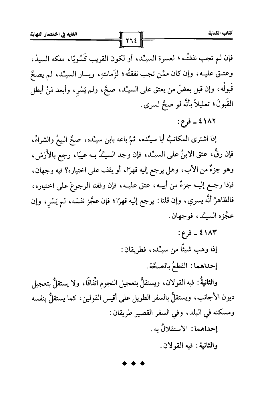 فإن لم تجب نفقتُه؛ لعسرة السيِّد، أو لكون القريب كَسُوبًا، ملكه السيدُ، وعتق عليه، وإن كان ممَّن تجب نفقتُه؛ لزَمانتهِ، ويسار السيِّد، لم يصحَّ قَبولُه، وإن قبل بعضَ من يعتق على السيِّد، صحَّ، ولم يَسْرِ، وأبعد مَنْ أبطل القَبولَ؛ تعليلًا بأنَّه لو صحَّ لسرى.