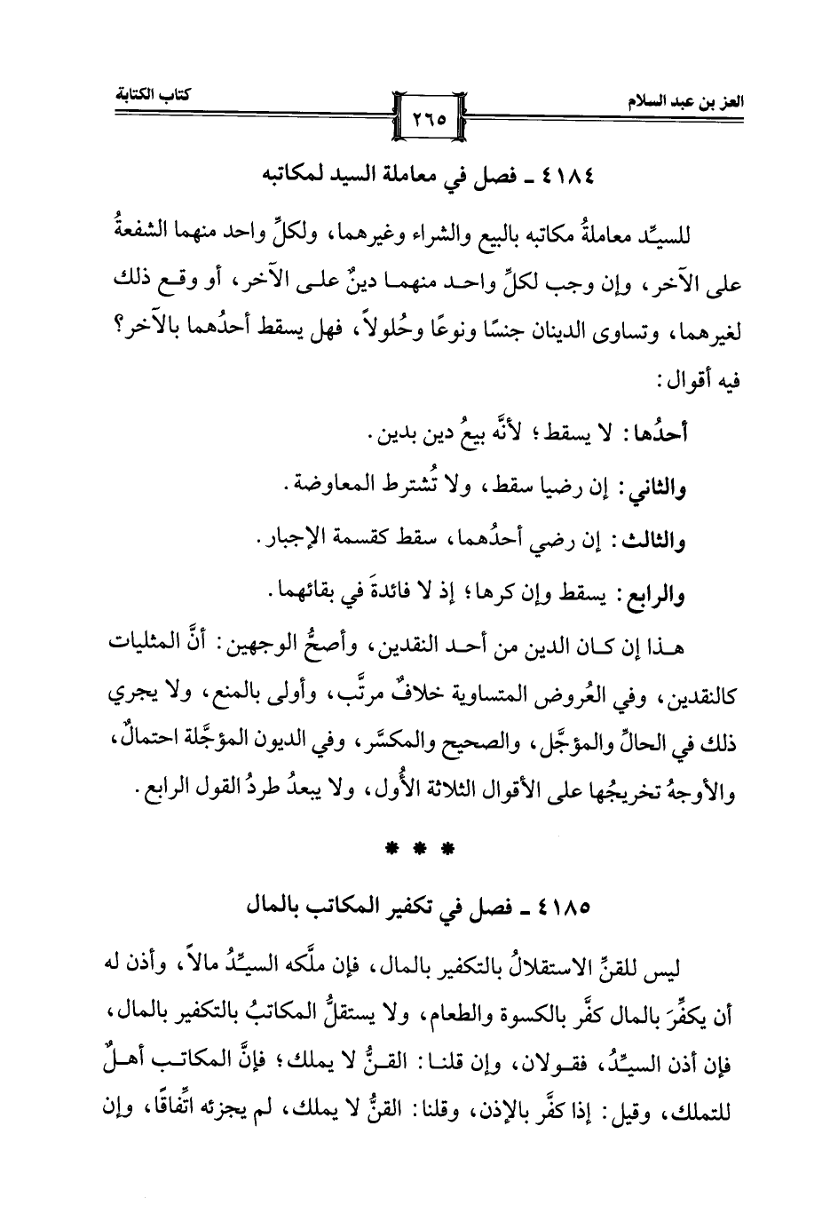 للسيِّد معاملةُ مكاتبه بالبيع والشراء وغيرهما، ولكلِّ واحد منهما الشفعةُ على الآخر، وإن وجب لكلِّ واحد منهما دينٌ على الآخر، أو وقع ذلك لغيرهما، وتساوى الدينان جنسًا ونوعًا وحُلولًا، فهل يسقط أحدُهما بالآخر؛ فيه أقوال: