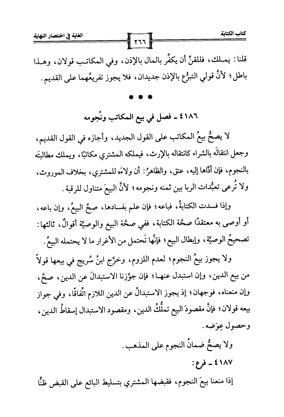 لا يصحُّ بيعُ المكاتب على القول الجديد، وأجازه في القول القديم، وجعل انتقالَه بالشراء كانتقاله بالإرث، فيملكه المشتري مكاتبًا، ويملك مطالبتَه بالنجوم، فإن أدَّاها إليه، عتق، والظاهرُ؛ أن ولاءَه للمشتري، بخلاف الموروث، ولا تُرعى تعبُّدات الربا بين ثمنه ونجومه؛ لأنَّ البيعَ متناول للرقبة.