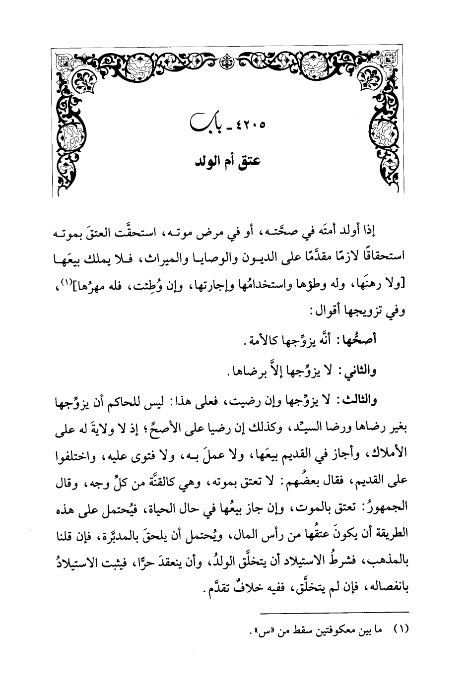 والثالث: لا يزوِّجها وإن رضيت، فعلى هذا: ليس للحاكم أن يزوِّجها بغير رضاها ورضا السيِّد، وكذلك إن رضيا على الأصحِّ؛ إذ لا ولايةَ له على الأملاك، وأجاز في القديم بيعَها، ولا عملَ به، ولا فتوى عليه، واختلفوا على القديم، فقال بعضُهم: لا تعتق بموته، وهي كالقنَّة من كلِّ وجه، وقال الجمهورُ: تعتق بالموت، وإن جاز بيعُها في حال الحياة، فيُحتمل على هذه الطريقة أن يكونَ عتقُها من رأس المال، ويُحتمل أن يلحقَ بالمدبَّرة، فإن قلنا بالمذهب، فشرطُ الاستيلاد أن يتخلَّق الولدُ، وأن ينعقدَ حرًّا، فيثبت الاستيلادُ بانفصاله، فإن لم يتخلَّق، ففيه خلافٌ تقدَّم.
