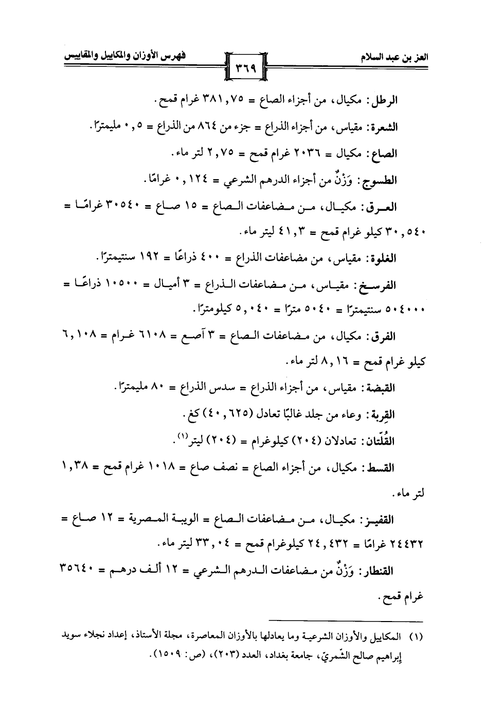 (¬1) المكاييل والأوزان الشرعية وما يعادلها بالأوزان المعاصرة، مجلة الأستاذ، إعداد نجلاء سويد إِبراهيم صالح الشّمريّ، جامعة بغداد، العدد (203)، (ص: 1509).