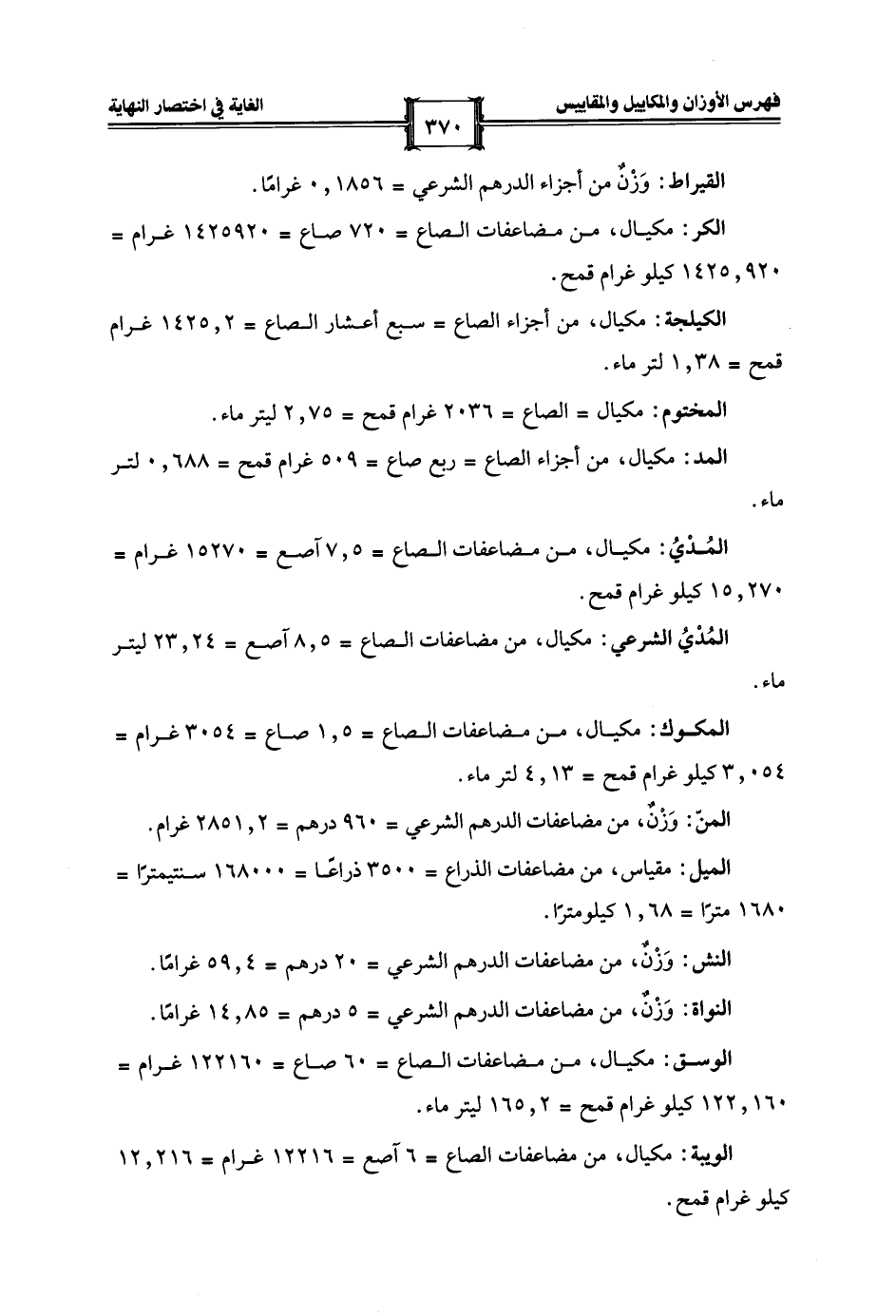 المختوم: مكيال= الصاع= 2036 غرام قمح = 2.75 ليتر ماء.