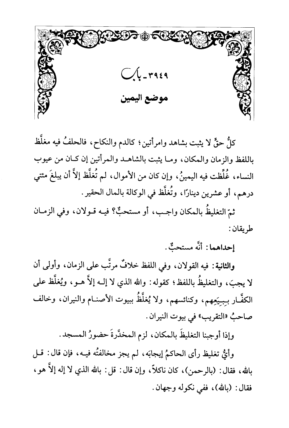 والثانية: فيه القولان، وفي اللفظ خلافٌ مرتَّب على الزمان، وأولى أن لا يجبَ، والتغليظُ باللفظ؛ كقوله: والله الذي لا إله إلَّا هو، ويُغلَّظ على الكفَّار بِبِيَعِهم، وكنائسهم، ولا يُغلَّظُ ببيوت الأصنام والنيران، وخالف صاحبُ "التقريب" في بيوت النيران.
